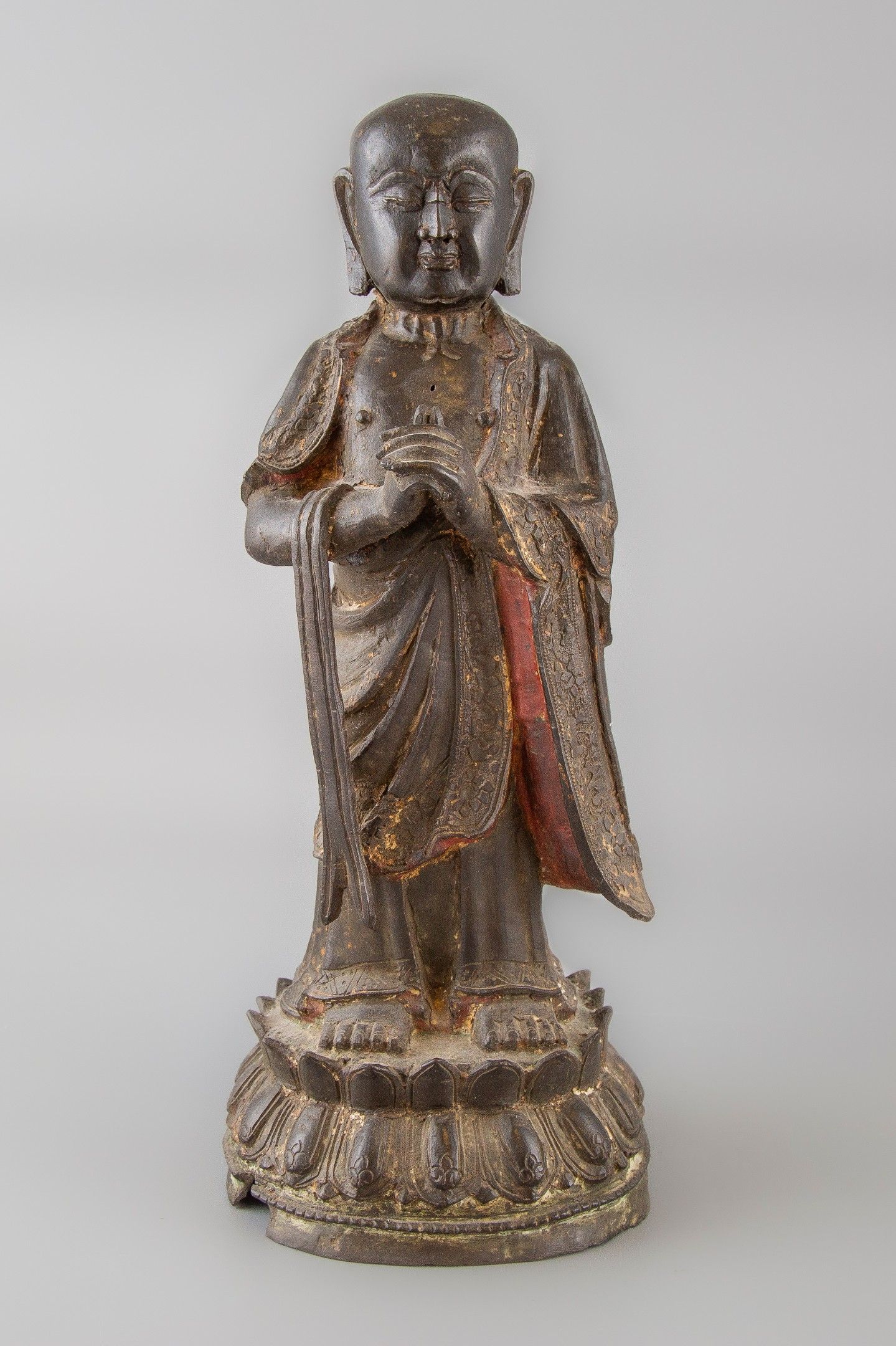 CHINE - Dynastie MING (1368 - 1644). Statuette du moine Ananda en bronze à patine brune, debout sur un socle en forme de lotus, les mains jointes devant lui. (Petits accidents). H. 36 cm. Expert : Cabinet Portier, Paris.