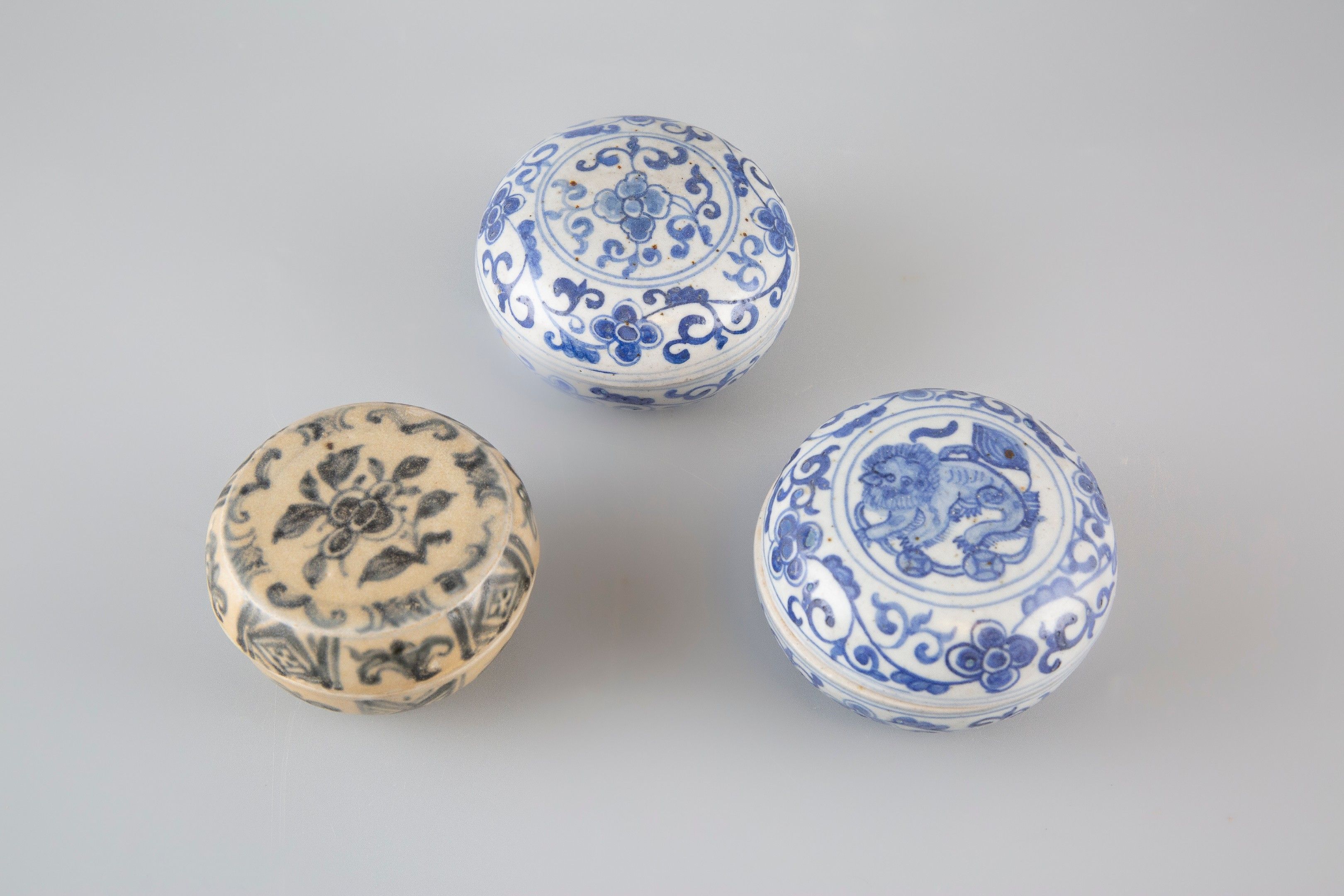 CHINE - Dynastie MING (1368 - 1644). Trois boites rondes en porcelaine bleu blanc à décor de fleurs de lotus et lions. Diam. 7,5 et 8 cm. Expert : Cabinet Portier, Paris.