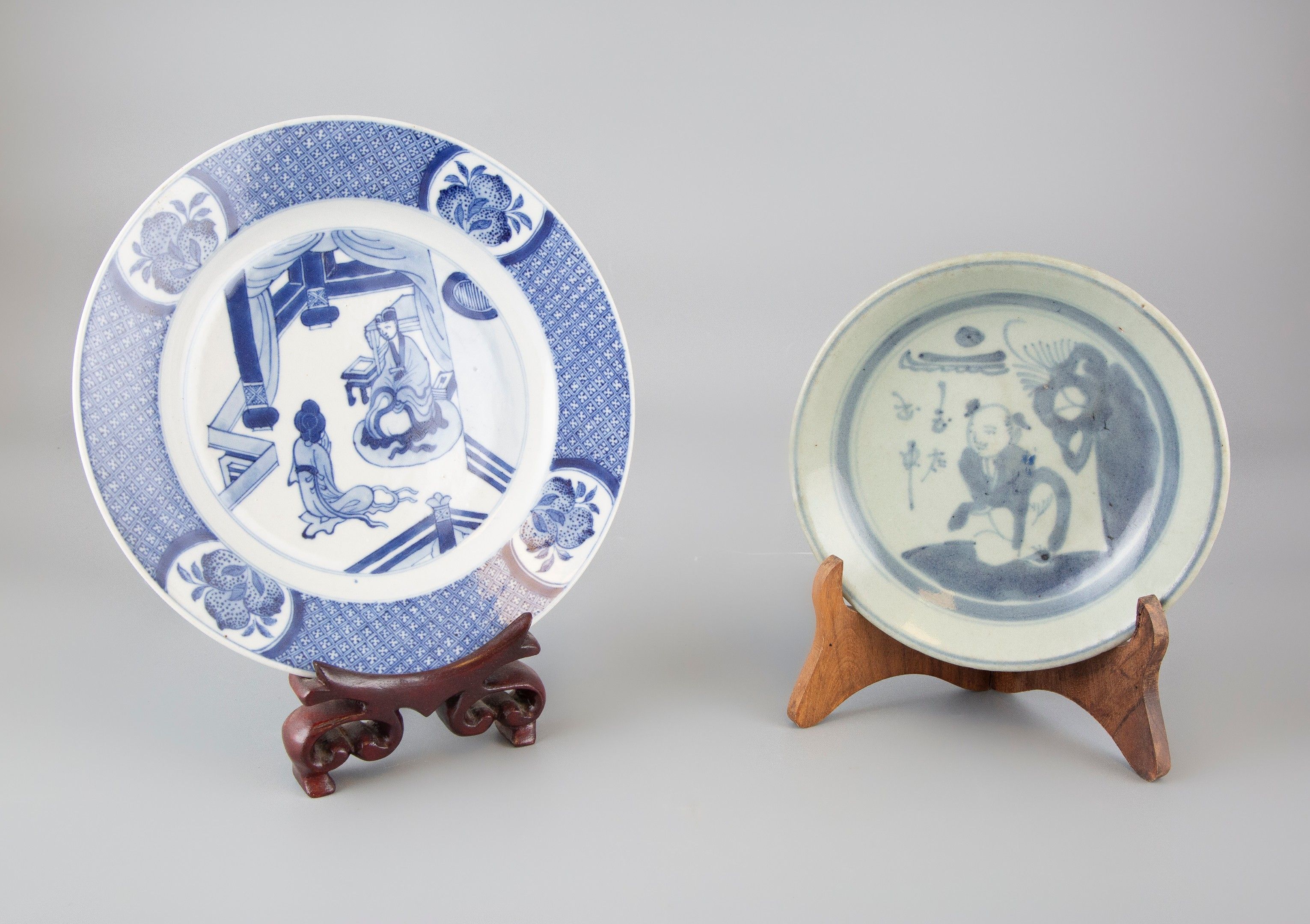 CHINE - Epoque KANGXI (1662 - 1722). Assiette en porcelaine bleu blanc à décor de couple. Marque apocryphe de Chenghua. Diam. 23 cm. On y joint une assiette en porcelaine bleu blanc à décor de personnage. Diam. 17,5 cm. Expert : Cabinet Portier, Paris.