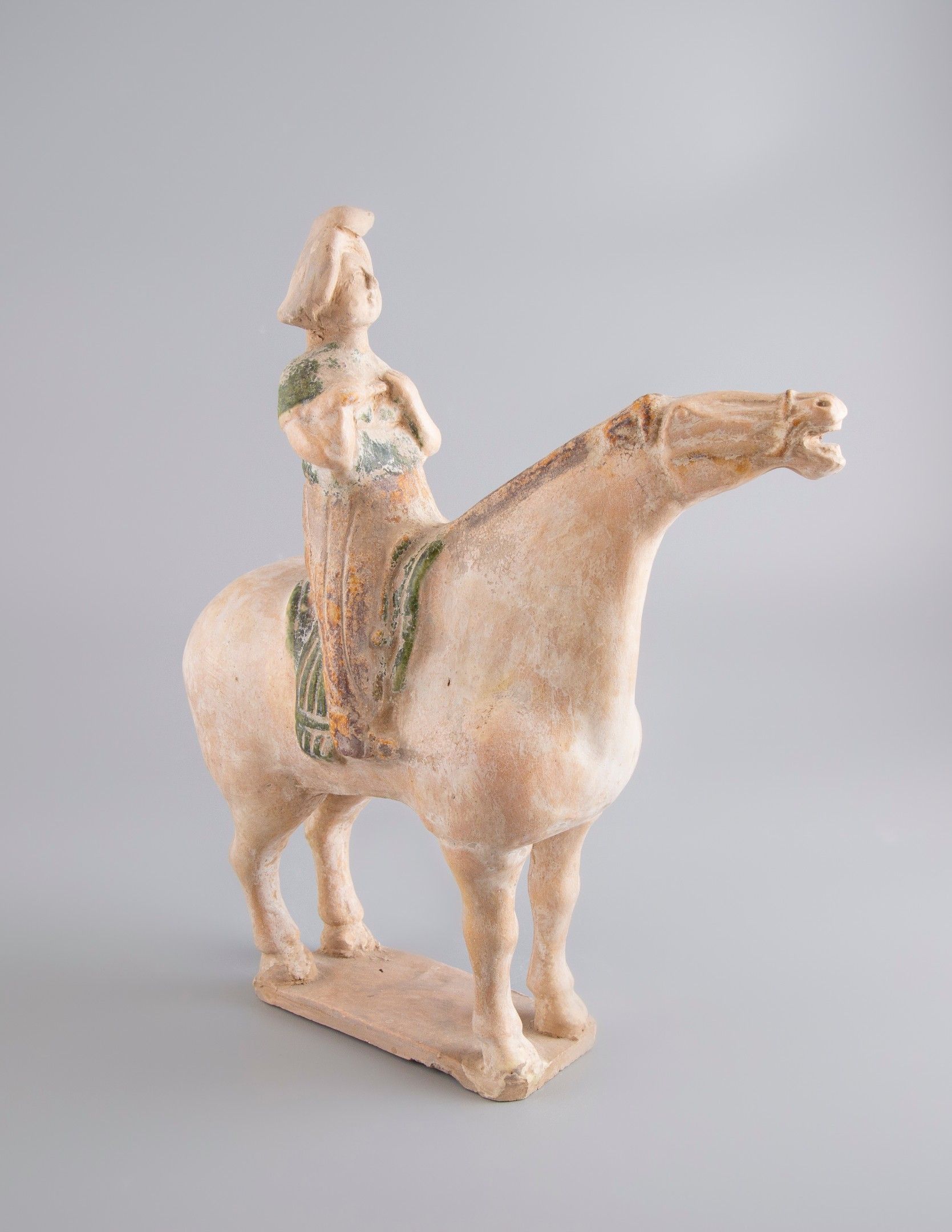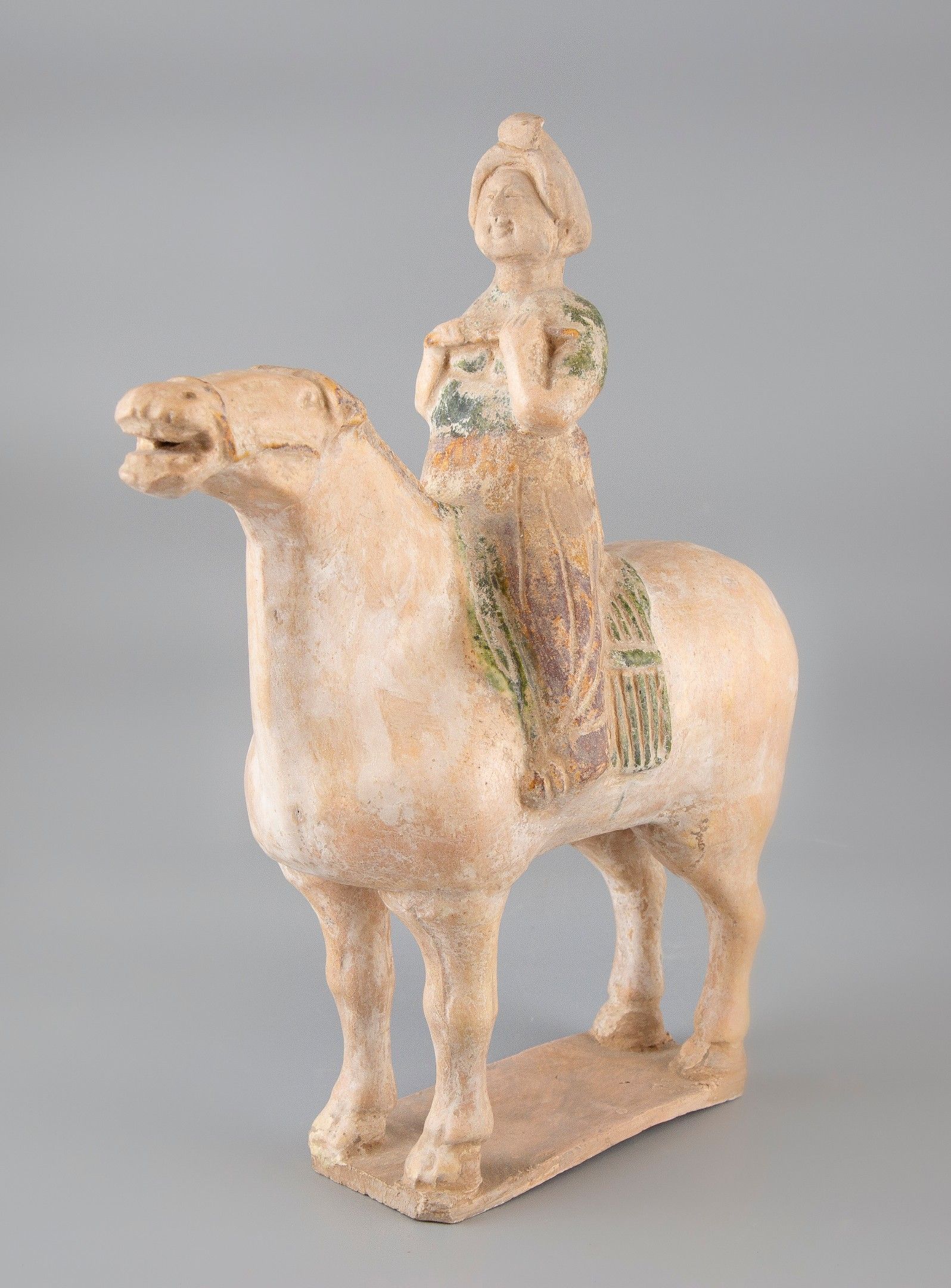 CHINE - Style Tang. Statuette de joueuse de flûte assise sur le dos d'un cheval posé sur un socle rectangulaire, le vêtement émaillé. H. 34 cm. Expert : Cabinet Portier, Paris.