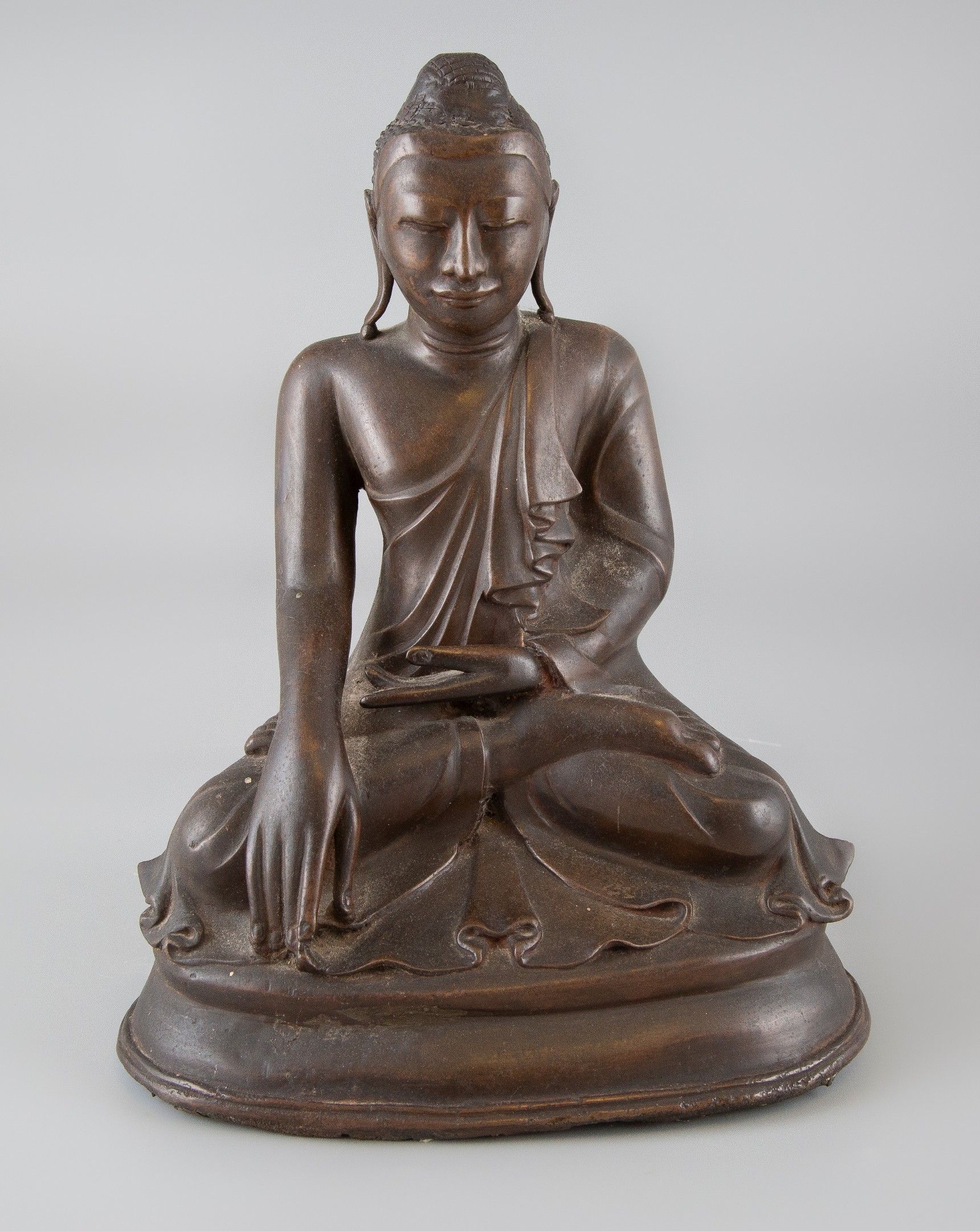 BIRMANIE, MANDALAY - XIXe siècle. Statuette de bouddha Maravijaya en bronze à patine brune, assis en dhyanasana, les mains en bhumisparsa mudra (geste de la prise de la terre à témoin), vêtu de sa robe monastique, la coiffe ornée de l'ushnisha. H. 43 cm. Expert : Cabinet Portier, Paris.