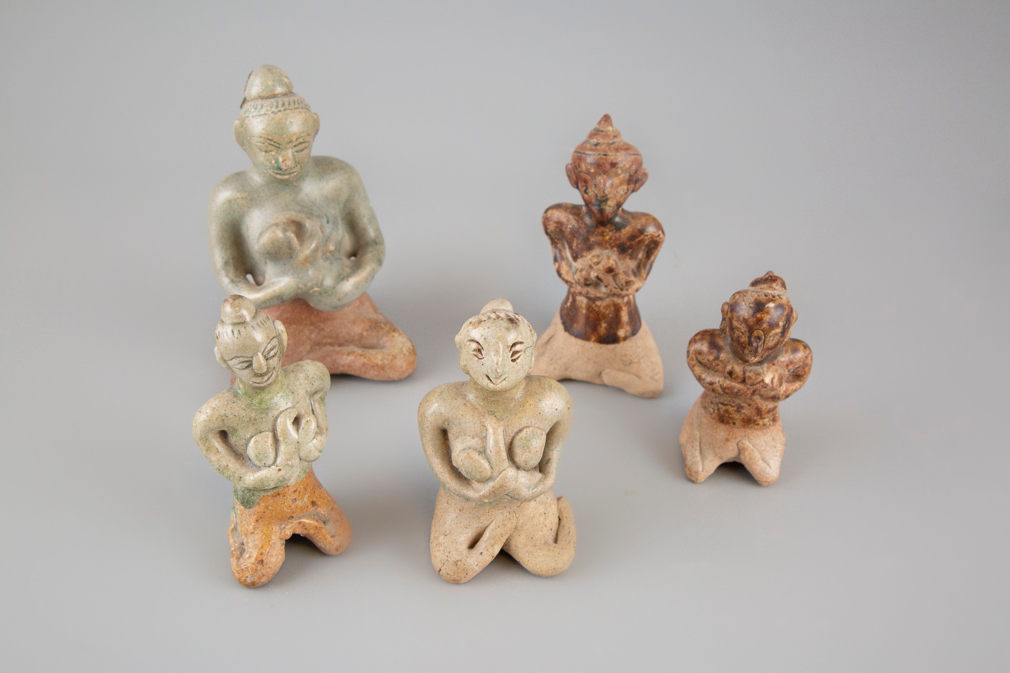 THAILANDE, Sawankalok - XVe/XVIe siècle. Cinq statuettes de jeunes femmes allaitant en grès émaillé céladon et brun. H. 9 et 11 et 12 et 14 cm. Expert : Cabinet Portier, Paris.