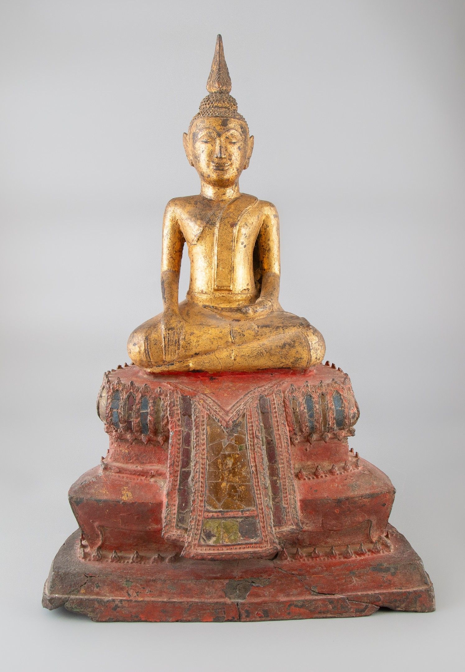 THAILANDE, Ratanakosin - XIXe siècle. Statuette de bouddha en bronze laqué or, assis en virasana sur un haut socle laqué rouge et incrusté de verres polychromes, la main droite en bhumisparsa mudra (geste de la prise de la terre à témoin). (Petits accidents). H. 52 cm. Expert : Cabinet Portier, Paris.