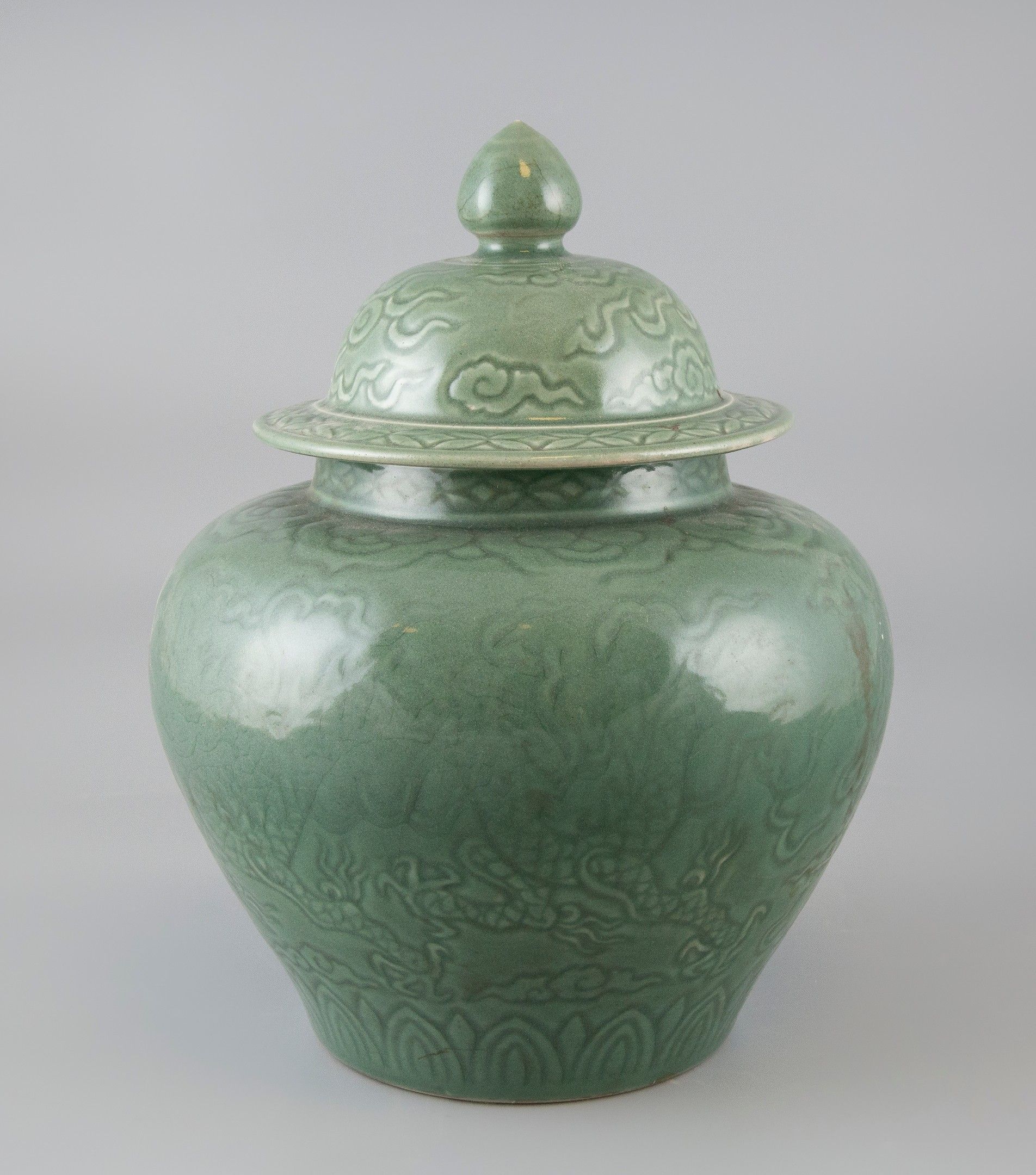THAILANDE - XXe siècle. Jarre couverte en porcelaine émaillée céladon à décor incisé de dragons parmi les nuages. H. 50 cm. Expert : Cabinet Portier, Paris.