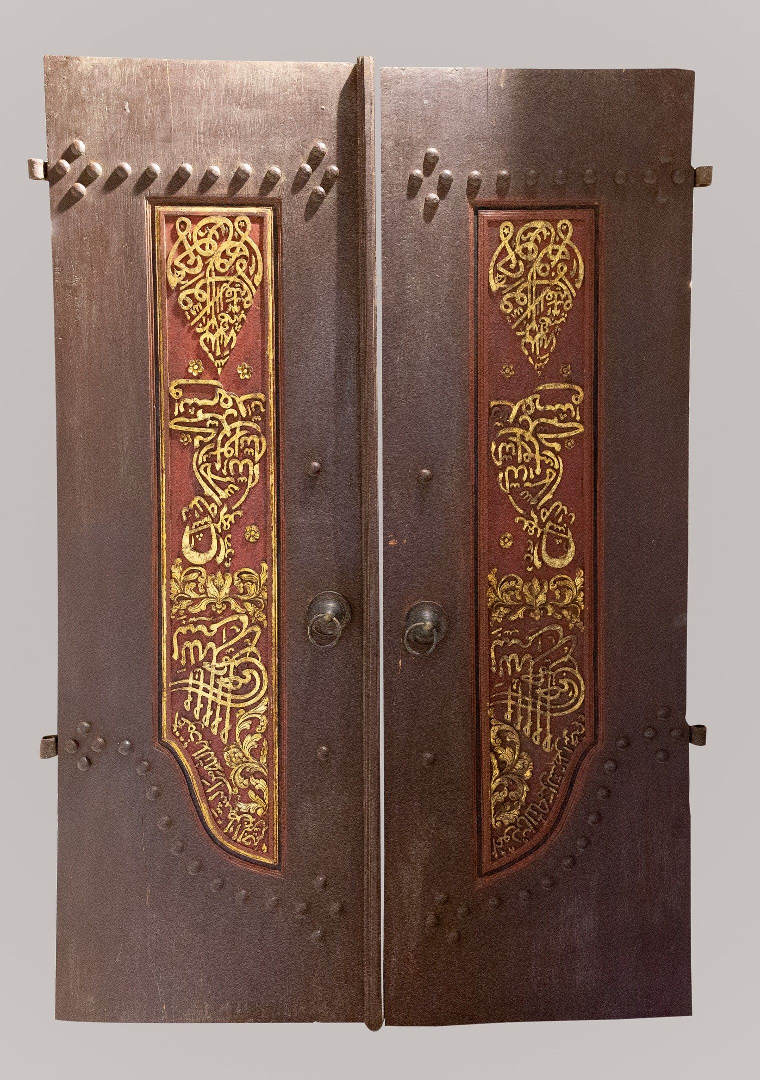 INDONESIE, JAVA - Début XXe siècle. Paire de portes probablement de mosquée en bois laqué or et rouge à décor d'inscriptions islamiques en or et formant un personnage. Les ferrures en fer. H. 196 cm. Larg. d'un volet 62 cm. Expert : Cabinet Portier, Paris.