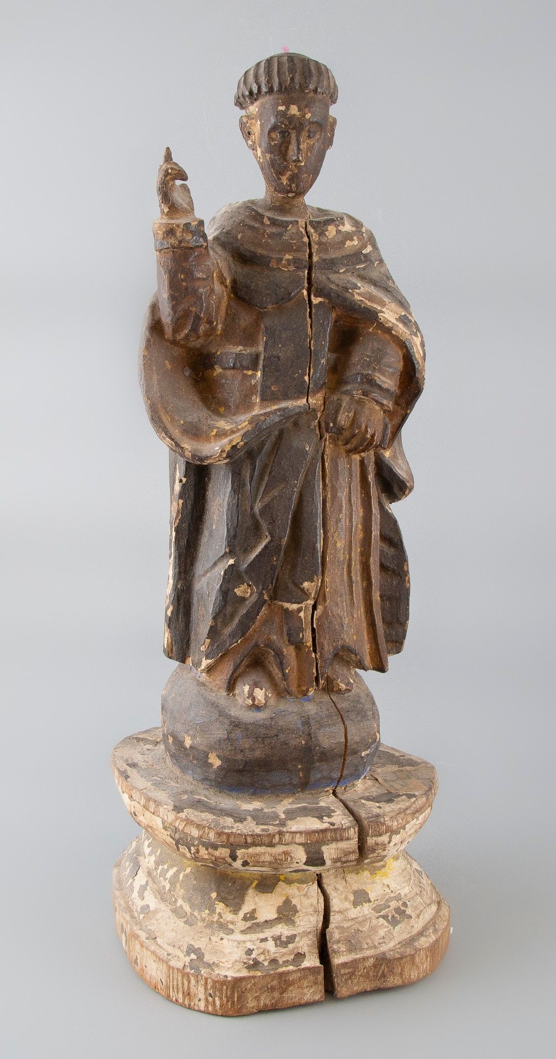 PHILIPPINES, BICOL - XVIIIe siècle. Statuette de Saint Vincent Ferrer en bois à traces de polychrome debout sur un socle, la main droite levée. (Manques et gerces). H. 49 cm. Expert : Cabinet Portier, Paris.