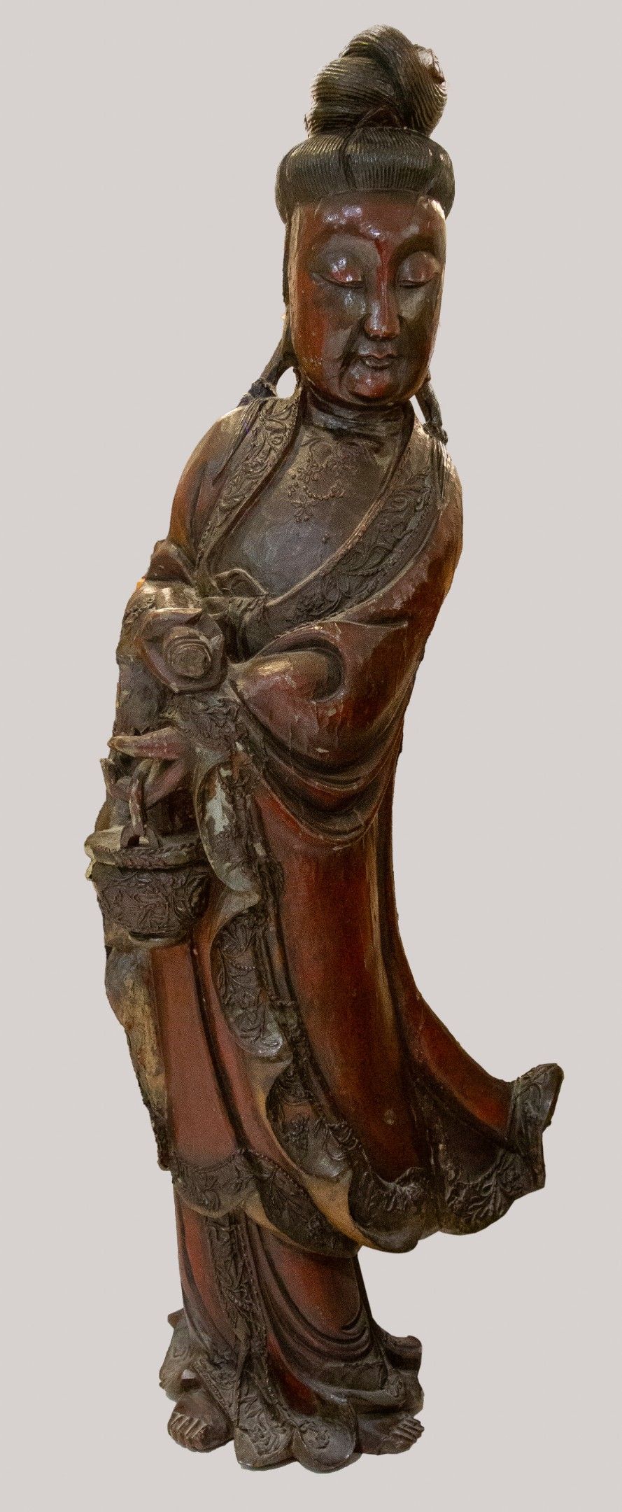 CHINE - Vers 1900. Grande statue de Guanyin en bois laqué brun rouge représentée debout, tenant un panier dans sa main gauche et un rouleau de sa main droite, les yeux mi-clos, les cheveux ramassés en chignon. Les bordures de sa robe décorées en léger relief de fleurs. 120x47x27cm. (Manques). Expert : Cabinet Portier, Paris.