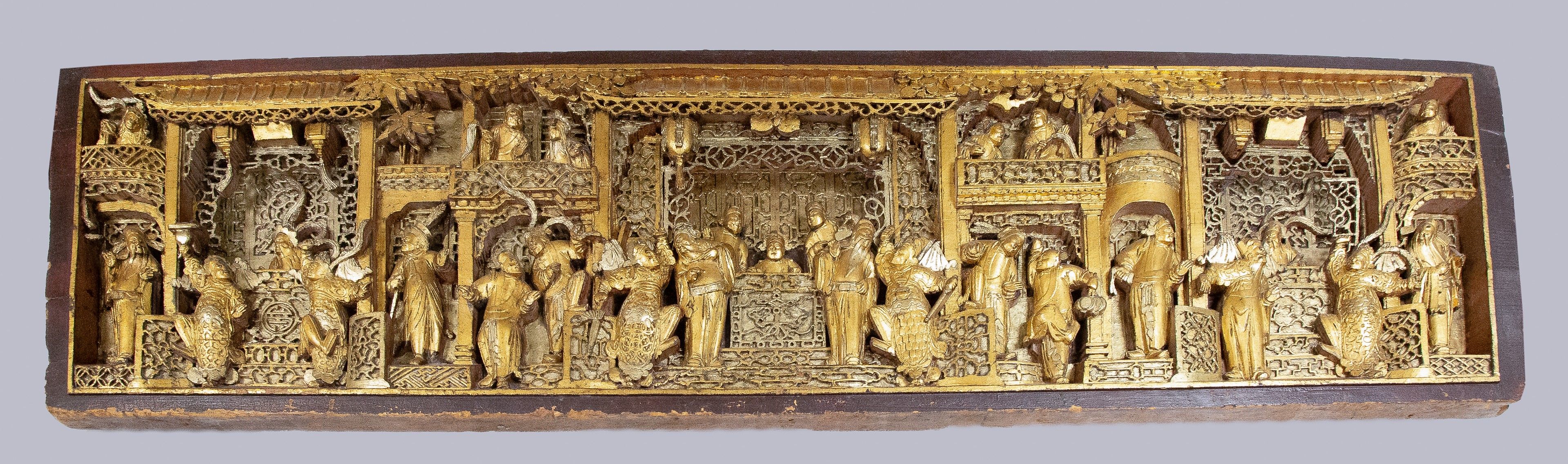 CHINE, Ningpo - Vers 1900. Grand panneau décoratif en bois sculpté en relief et laqué or et rouge de scènes représentant des acteurs dans un théâtre vêtus de robes richement décorées, et de spectateurs dans leurs loges. 60x211cm. (Petits accidents). Expert : Cabinet Portier, Paris.