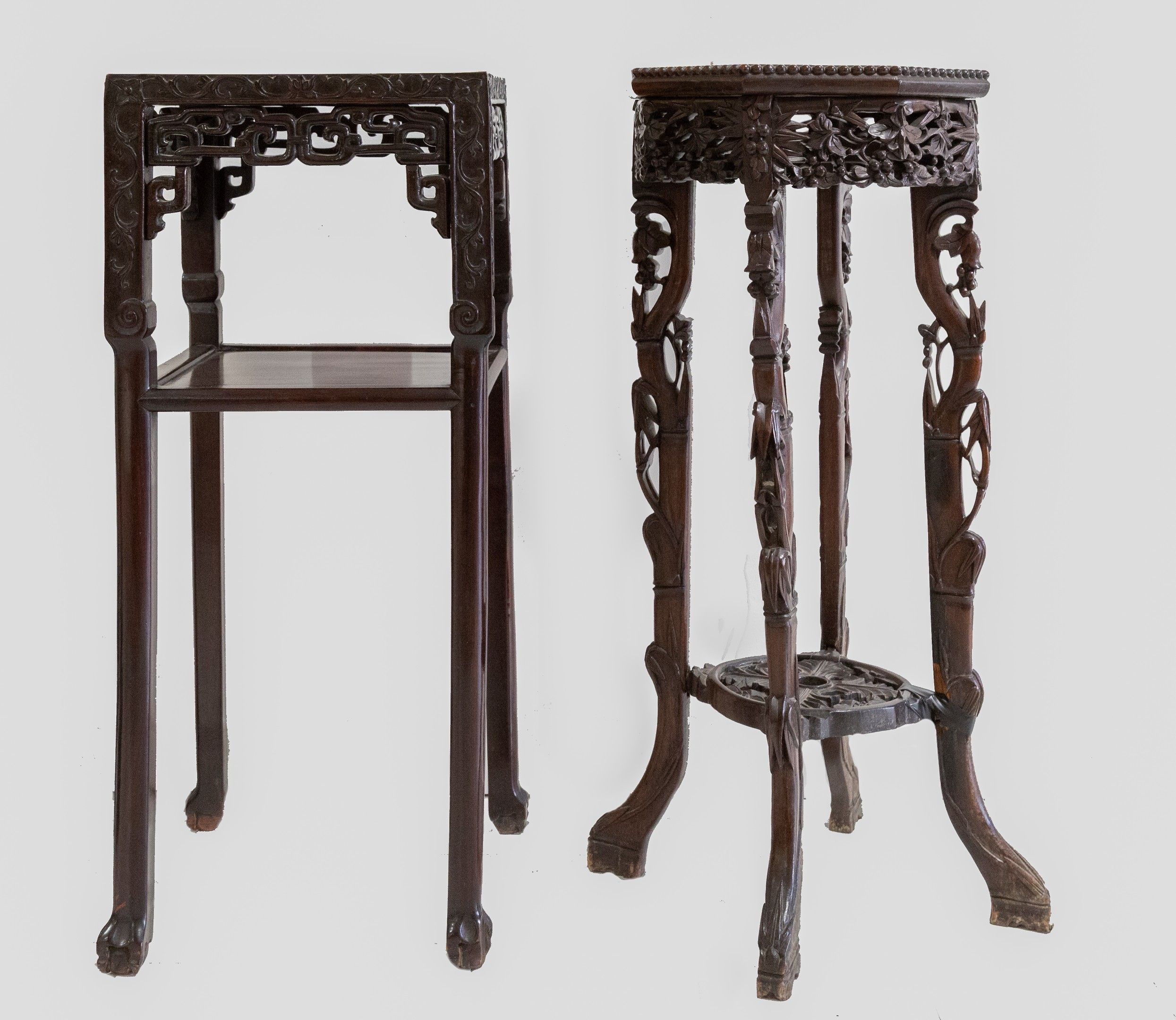 - Sellette de forme octogonale en bois sculpté reposant sur quatre pieds en forme de tiges de bambous, la ceinture de fleurs et fruits, l'entretoise ajourée d'une fleur à quatre pétales. Le plateau en marbre. (Accidents). 81x34x34cm.