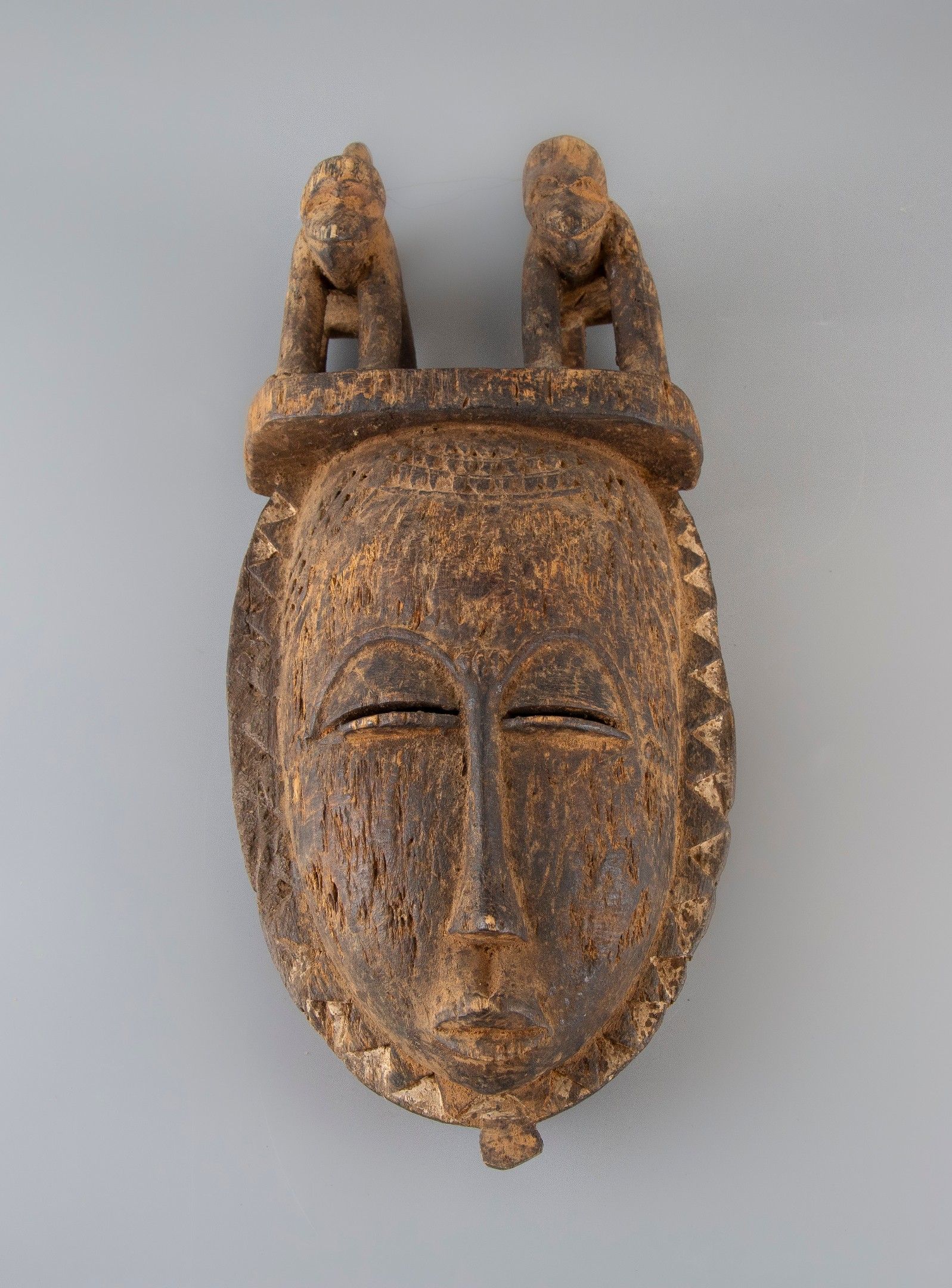 COTE D'IVOIRE - YAOURE. Masque de cérémonie,en bois sculpté surmonté de deux singes. Ht. 35cm. Rapporté de Cote d'Ivoire par l'ancienne propriétaire en 1972.