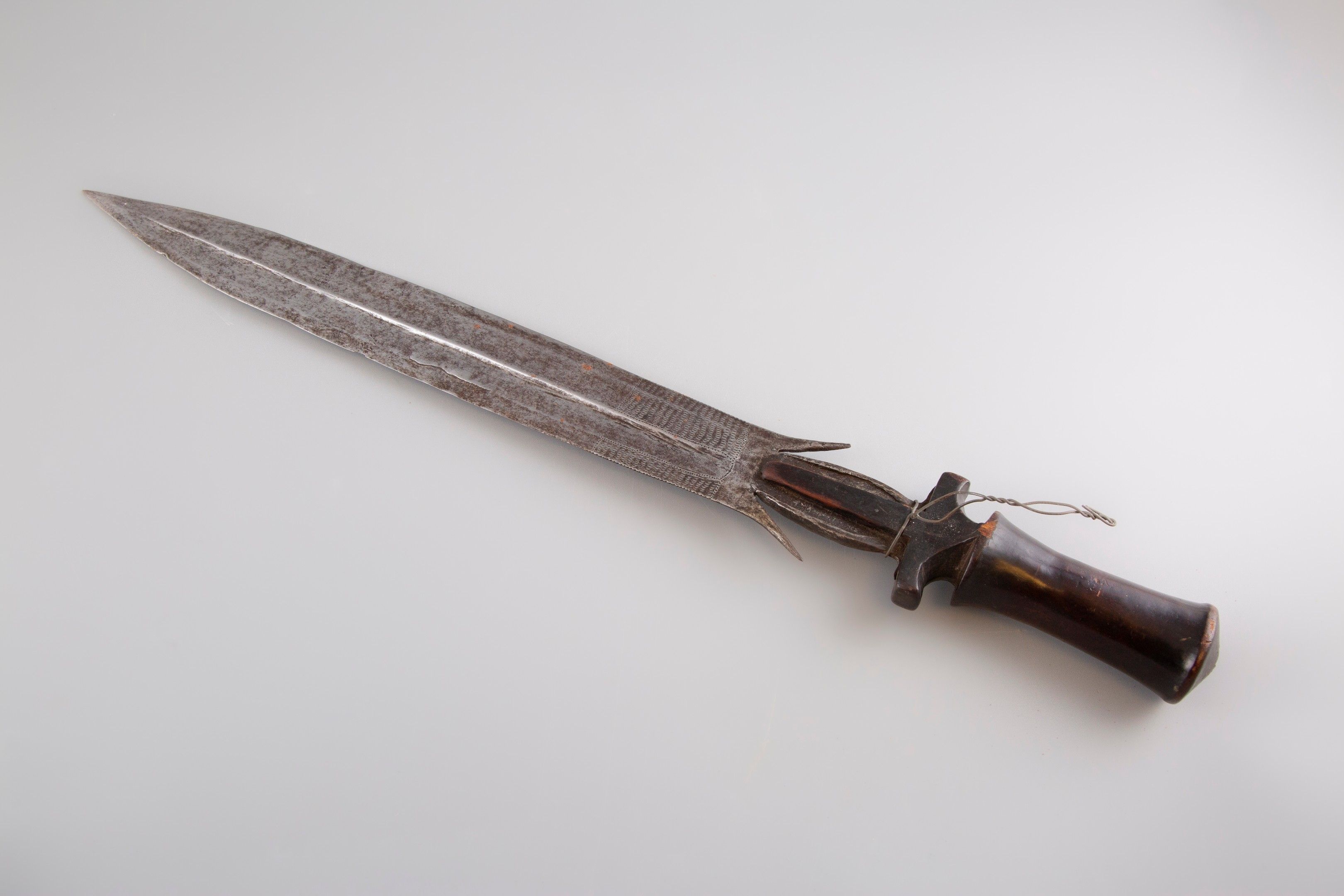 GABON. Poignard en acier à lame gravée, poignée en bois noirci. Longueur 57cm.