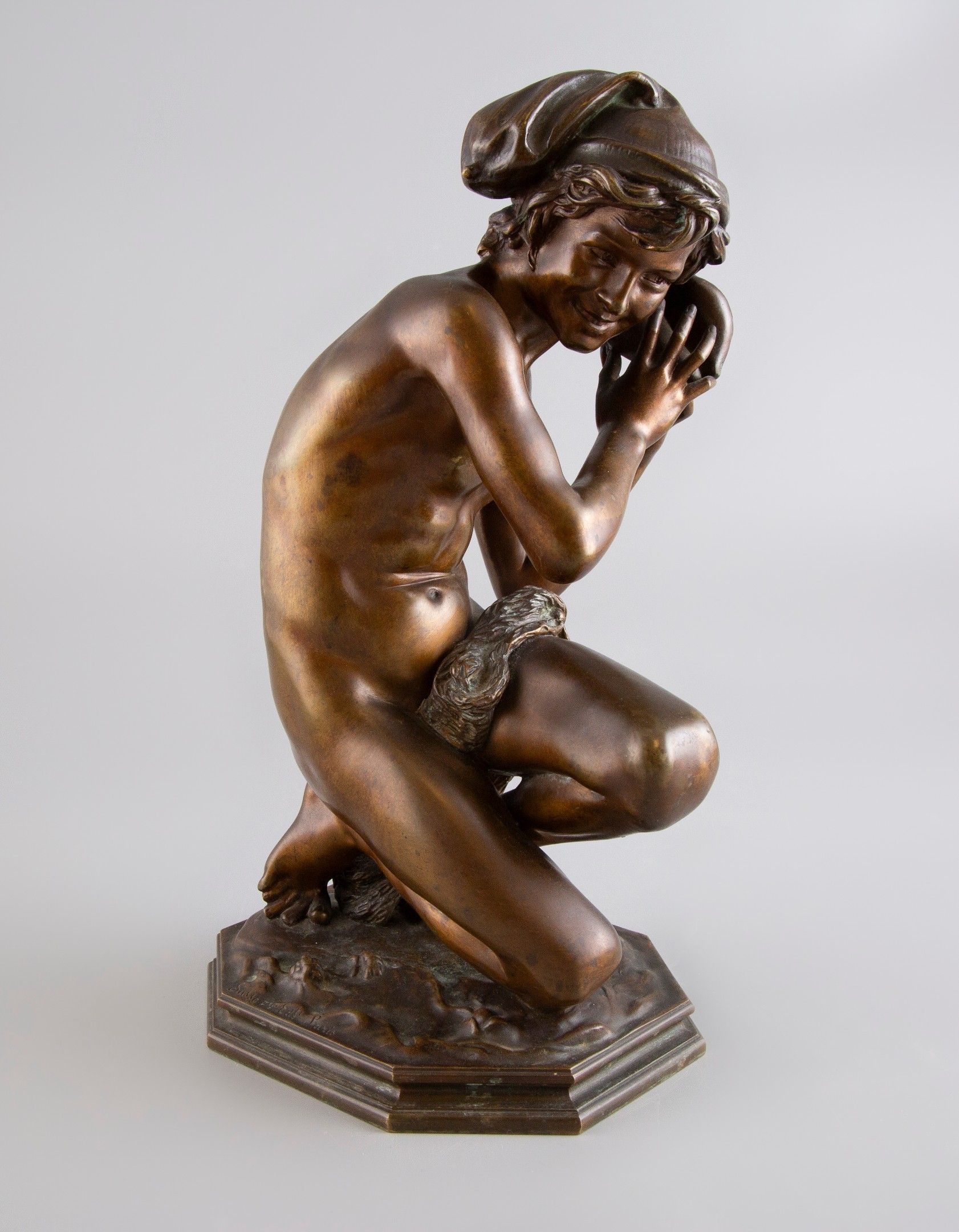 Jean-Baptiste CARPEAUX (1827-1875) "Pêcheur à la coquille n *. 3". Épreuve en bronze à patine médaille, signée sur la terrasse. Signature et Cachet Susse frères éditeurs, Paris sur le terrasse. H 34,5 cm. Petit usure localisée de patine. Expert : Cabinet Chanoit, Paris.