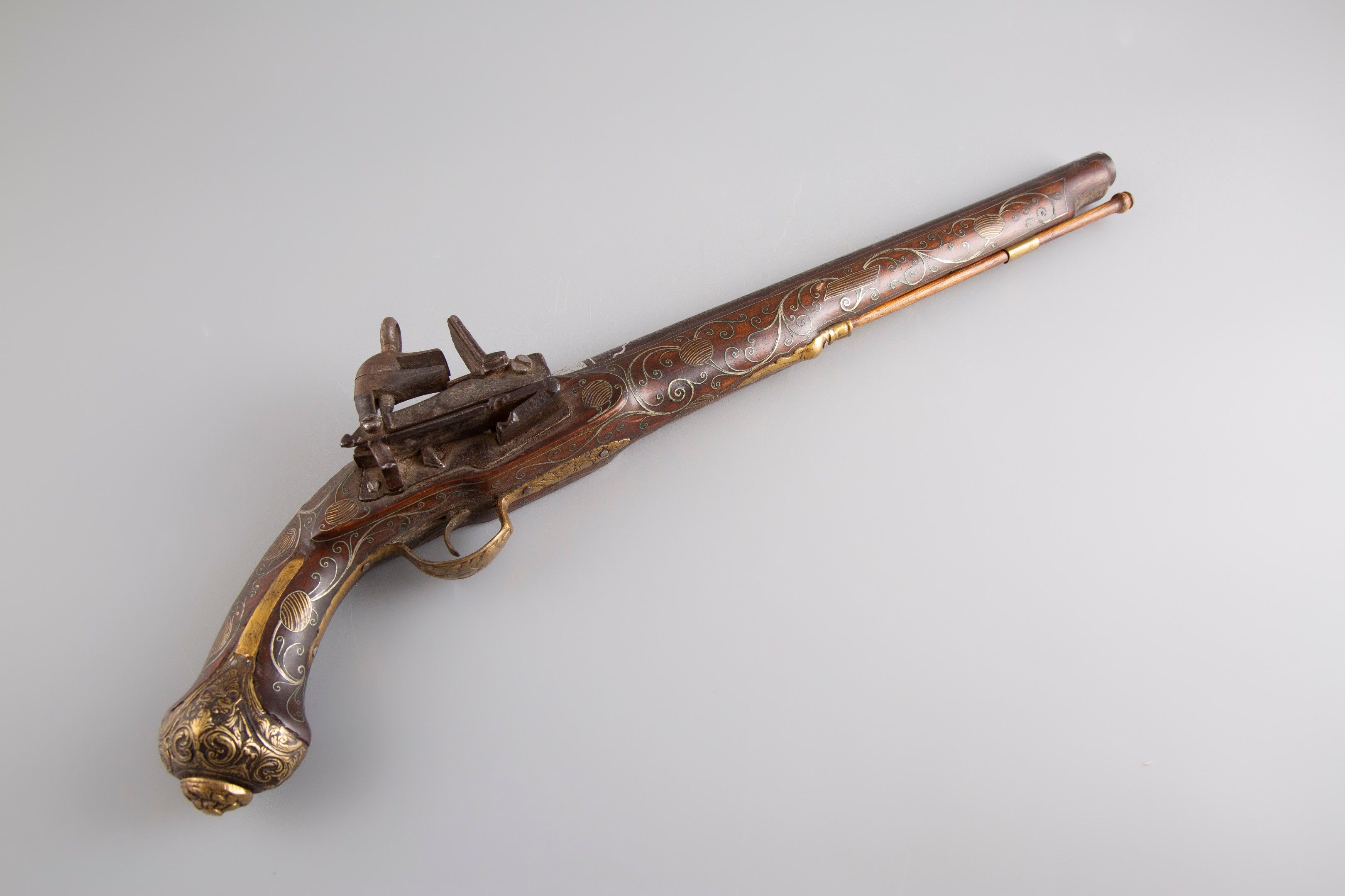 Platine à la Morlaque à corps plat. Garnitures en laiton fondu, à décor de rinceaux feuillagés. Crosse très richement décorée d’incrustations de fil de laiton et de métal blanc. Baguette postérieure en bois. Longueur : 52 cm. (Usures)