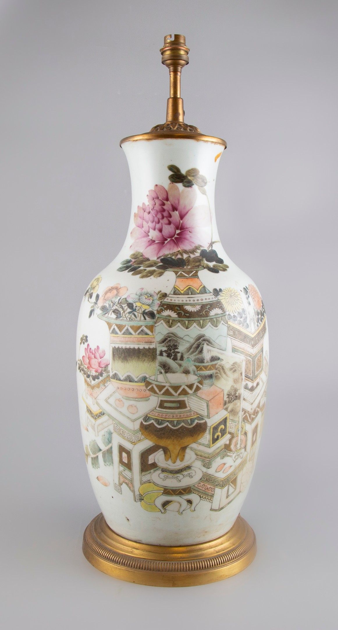 CHINE. Vase balustre en porcelaine à décors peint polychrome, d'objets domestiques. Monté à l'électricité. Ht. 46cm.