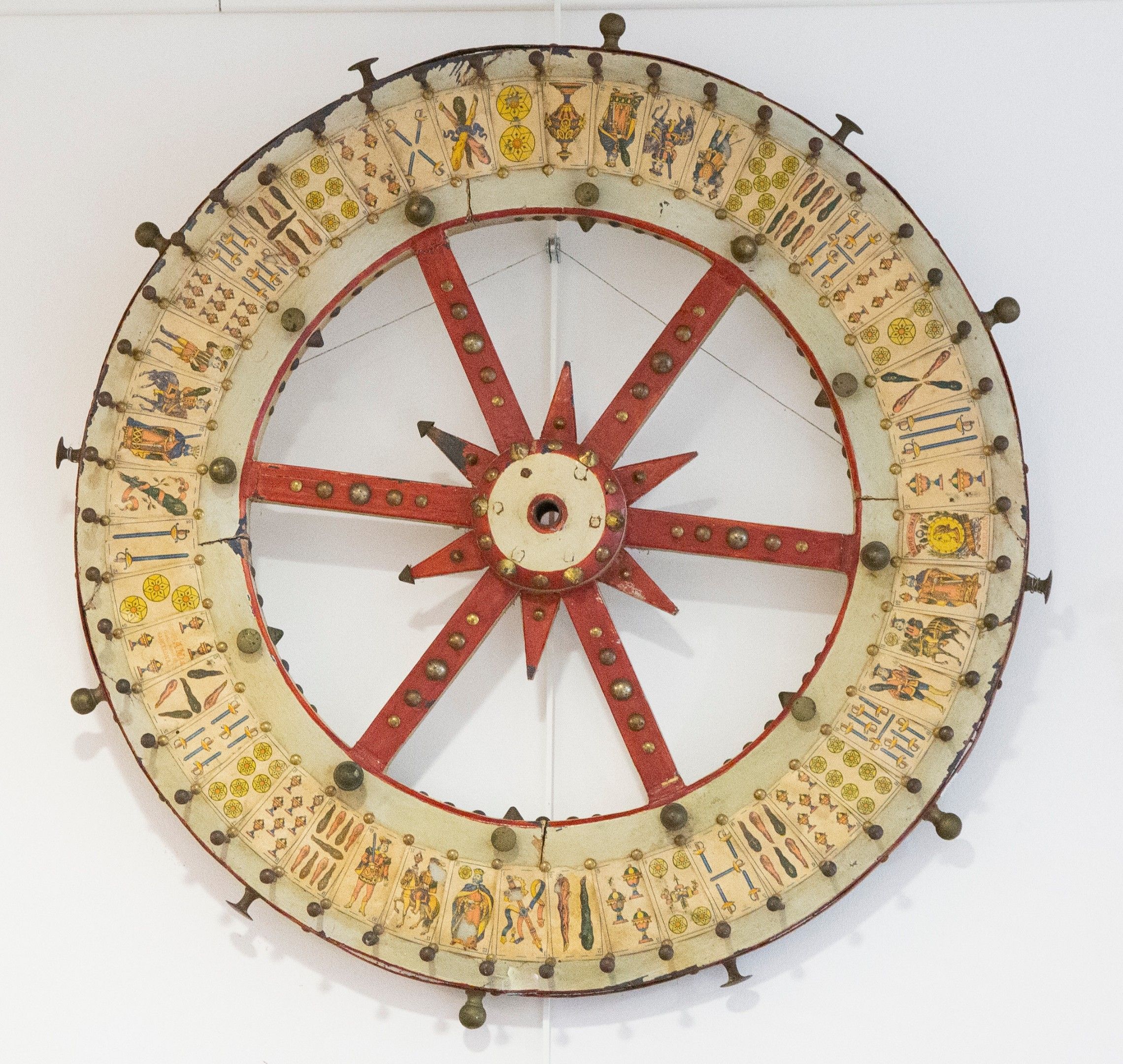 Loterie foraine dite roue de fortune. Espagne ou Sud de la France, début XXe siècle. Roue de loterie foraine, verticale à six rayons en bois. La mise se fait sur l’une des 48 cartes d’un jeu de cartes ancien de l’éditeur barcelonais COMAS, disposées en corolle sur la périphérie de la roue. État de conservation Nature, cet ensemble est resté assez frais, bien que quelques cartes aient été endommagées lors de l’utilisation. Diamètre de la roue 65 cm.. Expert : Philippe Crasse, Toulouse.