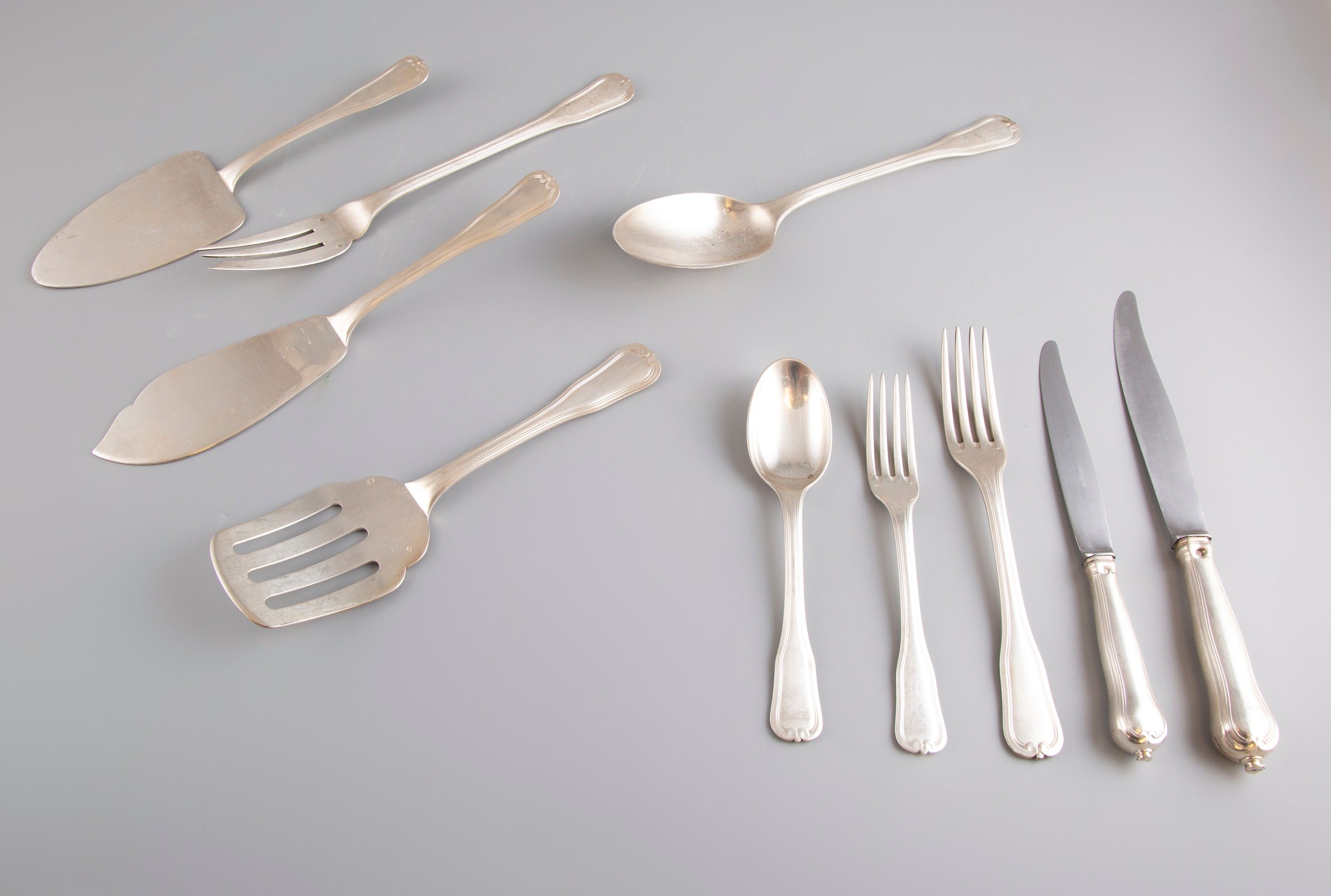 PUIFORCAT Emile. Ménagère en argent, poinçon Minerve, comprenant 60 pièces : 12 grandes fouchettes (1108,19g), 13 cuillères (753,27g), 12 petites fouchettes (696,20g), 5 couverts de service (674,12g), 12 grands couteaux lames métal signés et manches en argent fourré (1331,69g), 10 petits couteaux lames métal signé et manches en argent fourré (800,86g), 1 couteau à fromage lames métal signé et manches en argent fourré (85,74g). Poids argent : 3231,78g, Poids couteaux argent fourrés 2218,29g. Poids brut : 5450,07g.