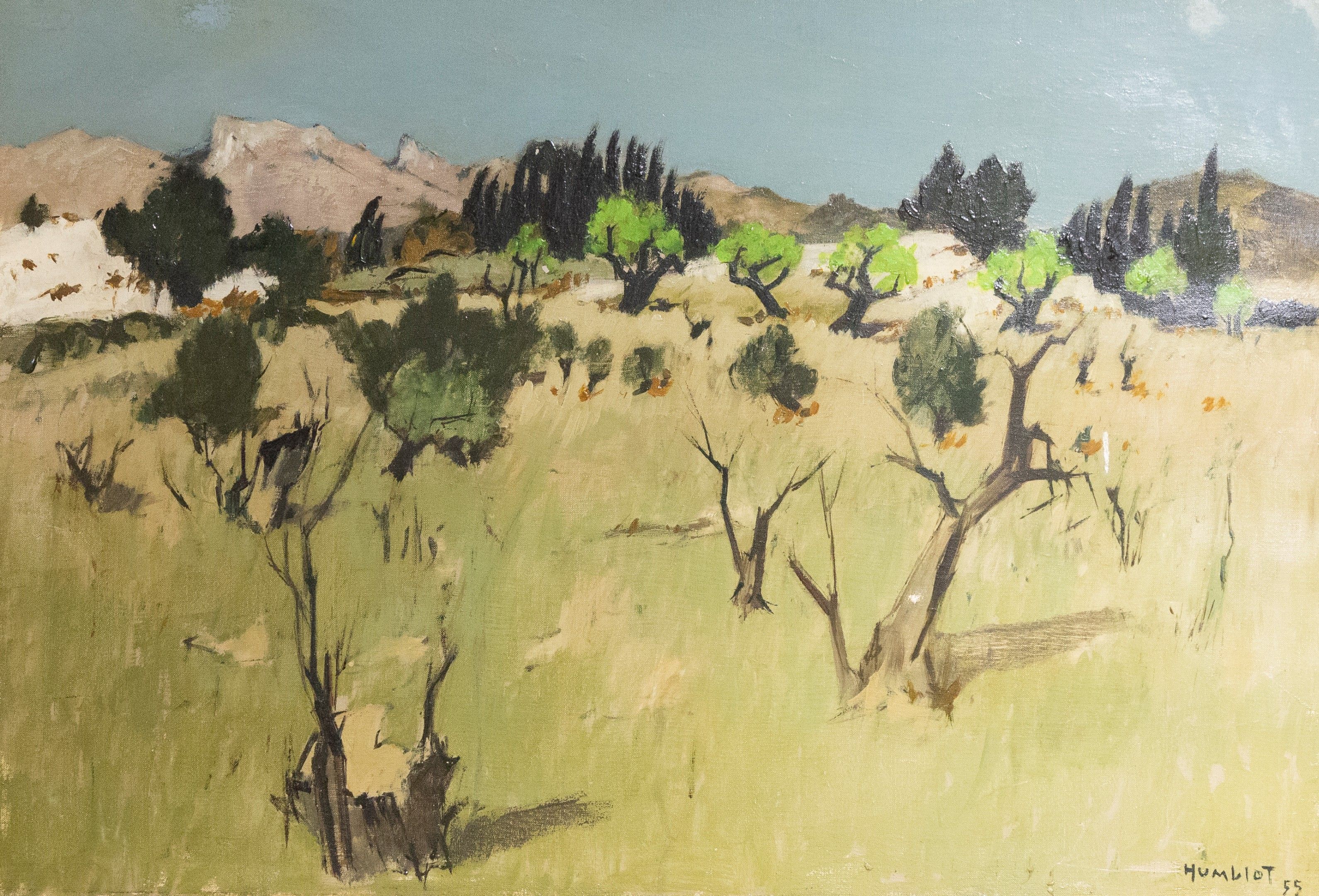 Robert HUMBLOT (1907-1962). "Paysage de provence aux oliviers". Huile sur toile, signée en bas à droite et datée 1955. 49x73cm. Légère restauration.