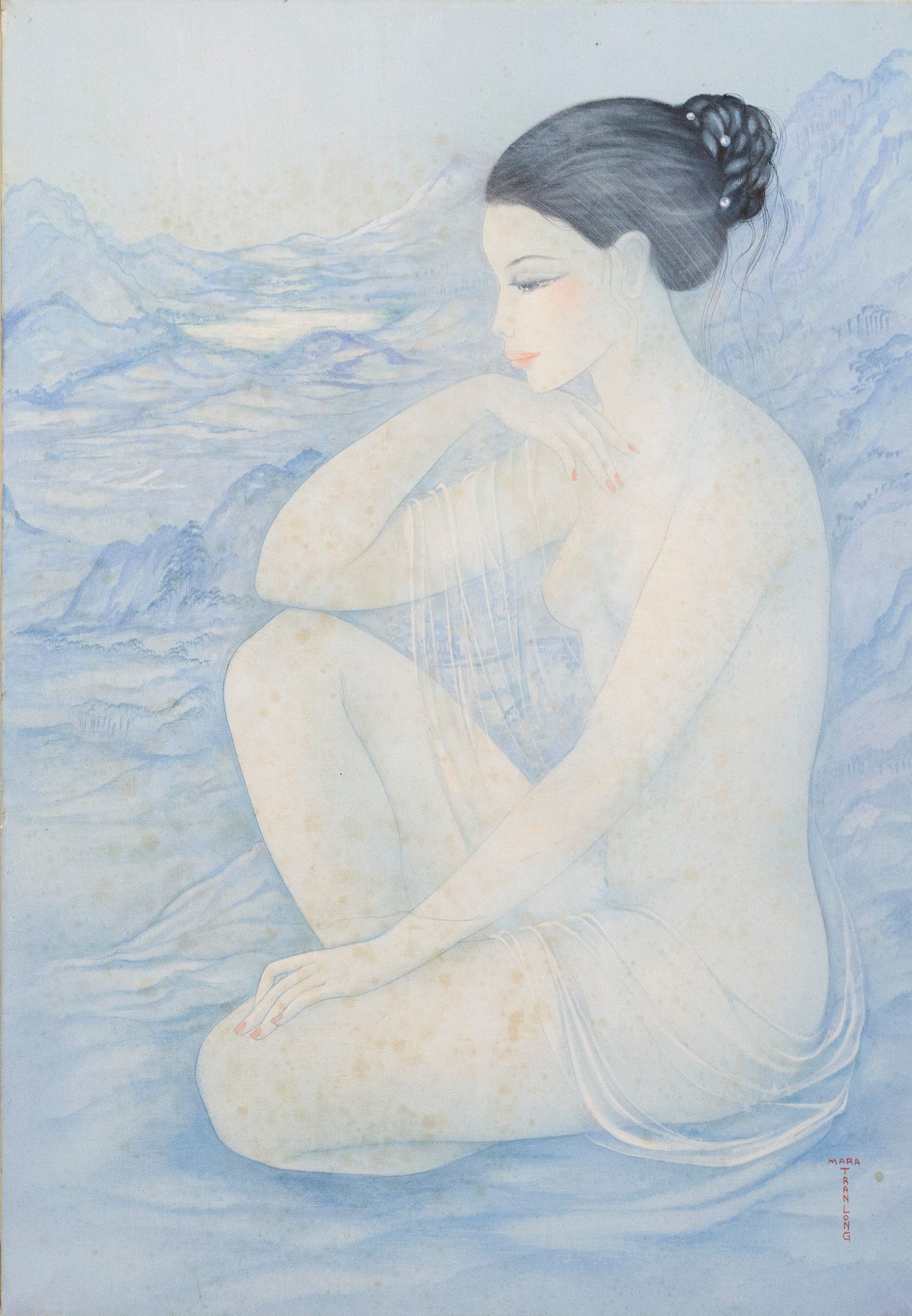 Mara TRAN LONG (1935). "Portrait de femme accroupie". Huile sur toile signée en bas à droite. 51x34cm. Tâches.