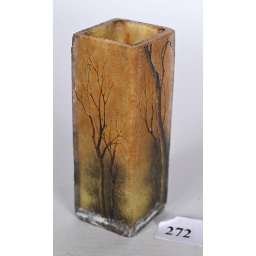 DAUM à NANCY. PETIT VASE de forme carrée en pâte de verre dégagé à l’acide représentant un paysage de sous-bois. Signé sous la base. H.9 L.3,5.