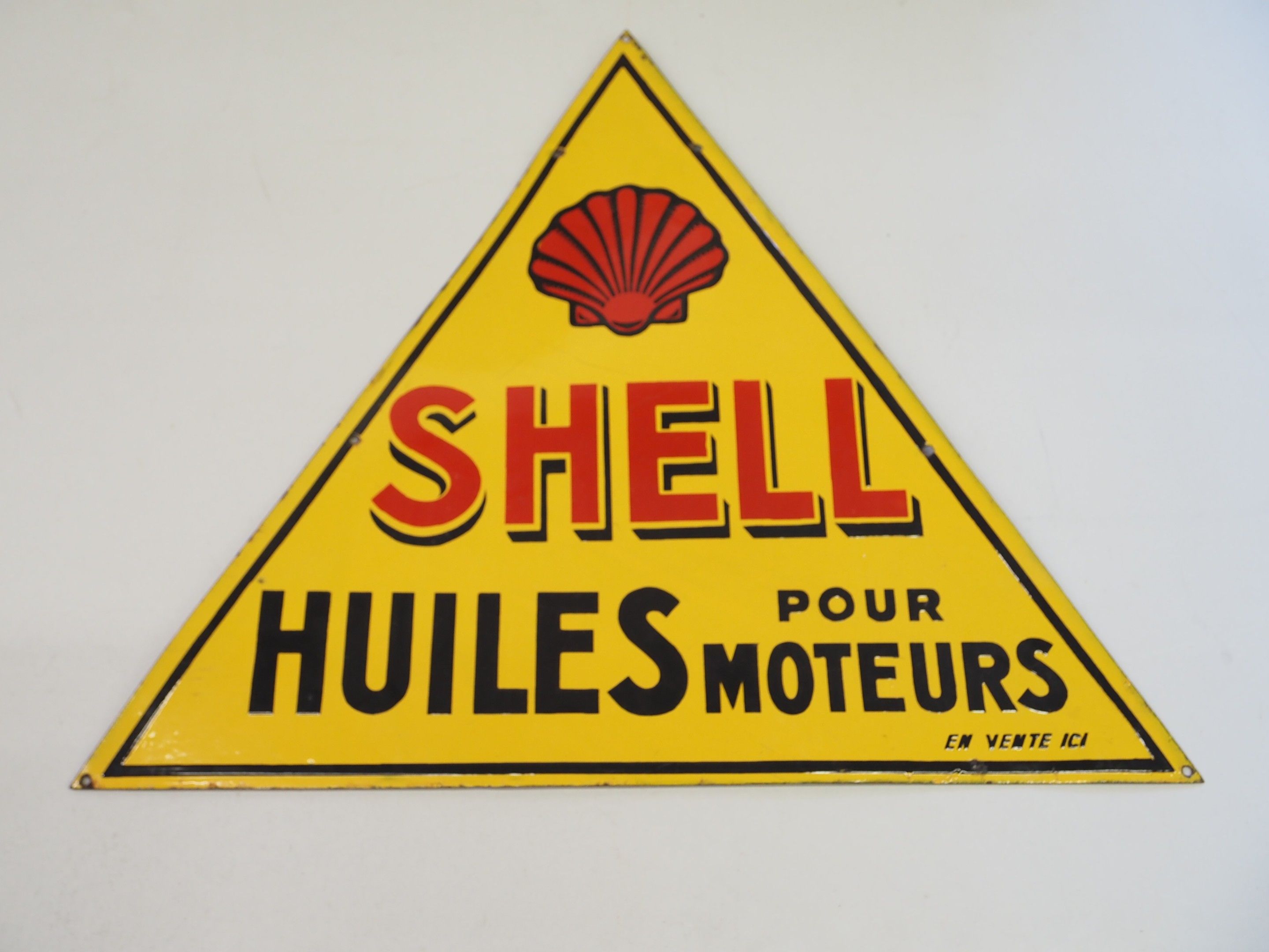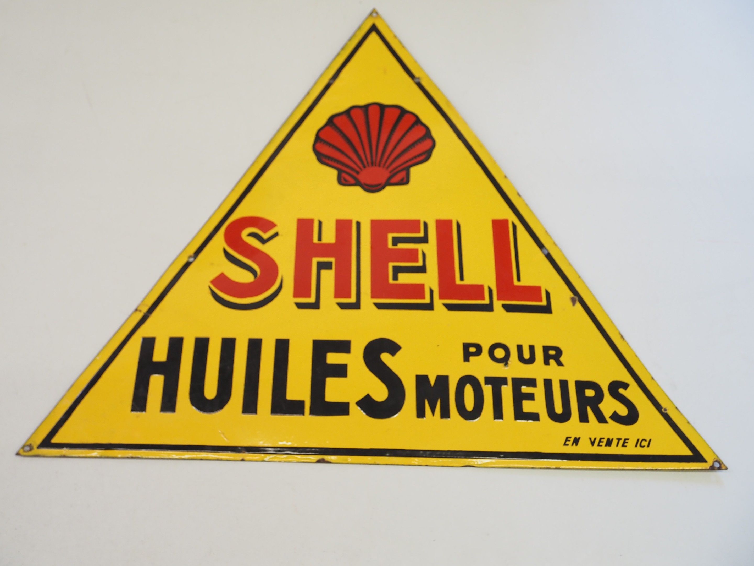 SHELL – HUILES POUR MOTEUR – En vente ici – Plaque en tôle émaillée double face – à coquille – et lettrage rouge et noir sur fond jaune – liseré noir – à 6 trous d’accroche – 68 x 77,5 cm – qq éclats et défauts de fabrication