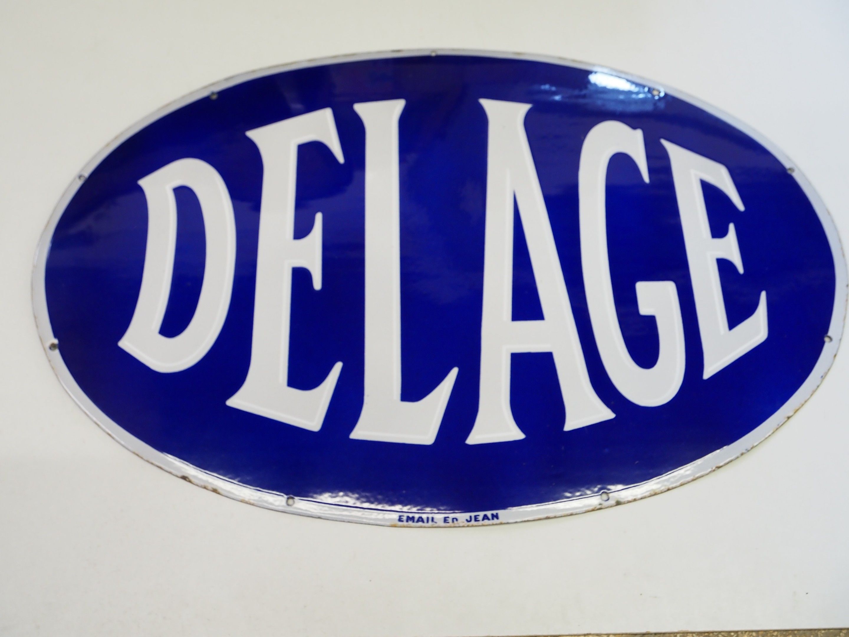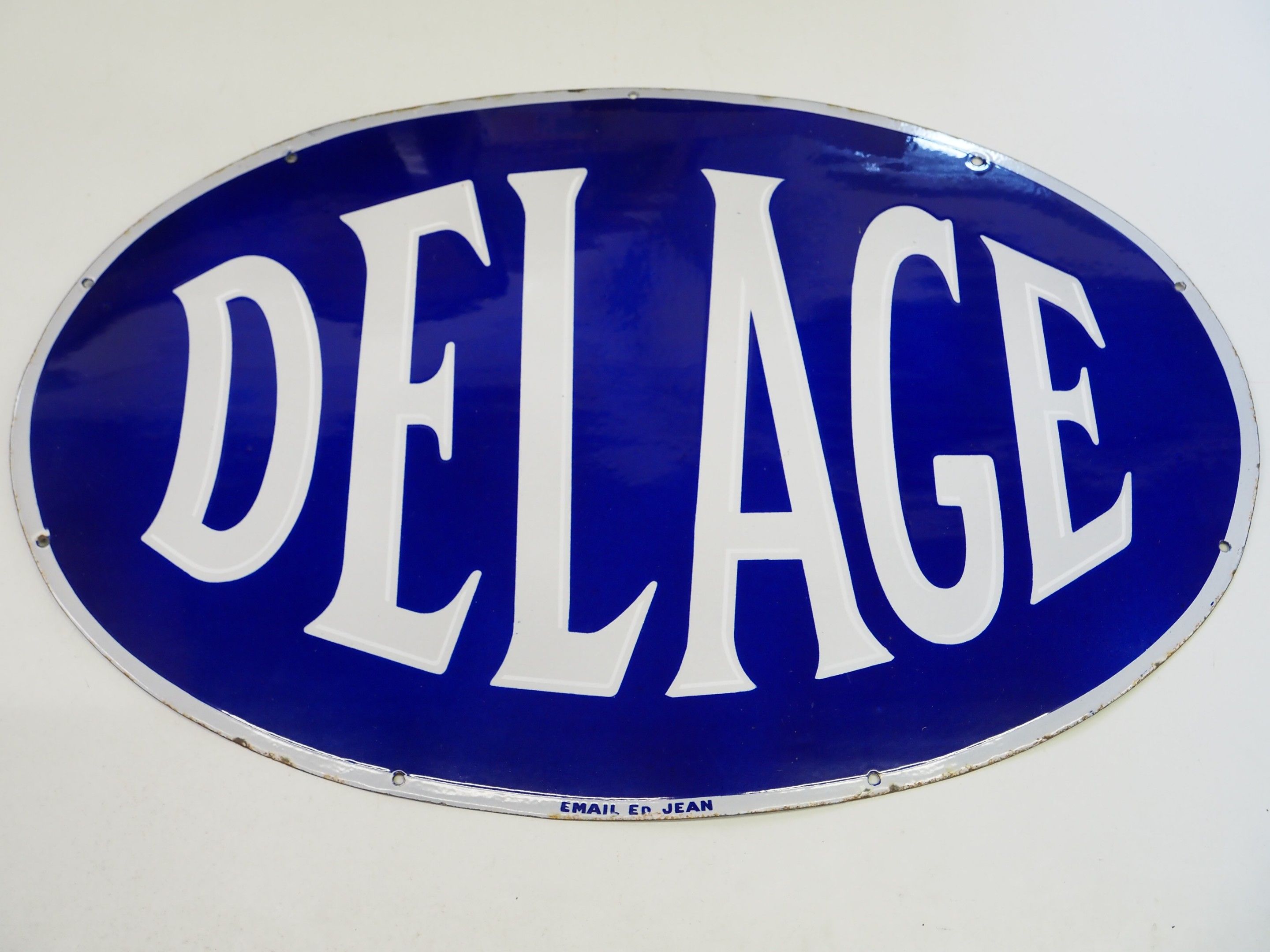 DELAGE – Grande plaque ovale en tôle émaillée à lettrage bla…