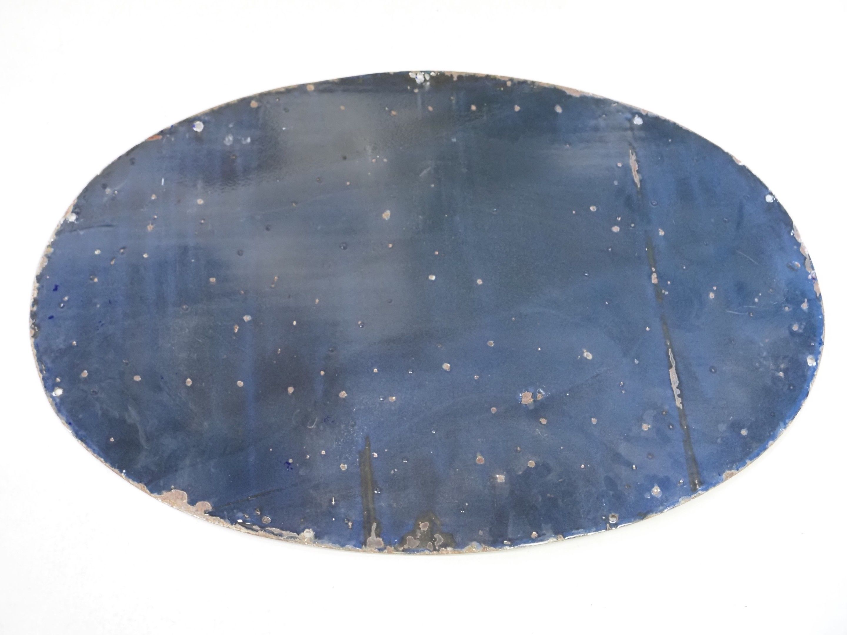 DELAGE – Grande plaque ovale en tôle émaillée à lettrage blanc en trompe l’œil sur fond bleu à liseré blanc – « Email Ed. JEAN » - 9 trous d’accroche – 66 x 99,5 cm – Bel état – lég acc en bordure