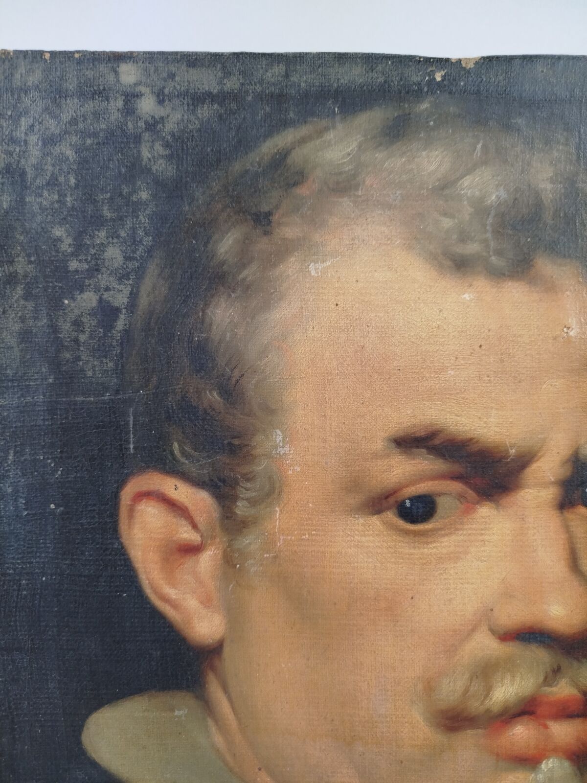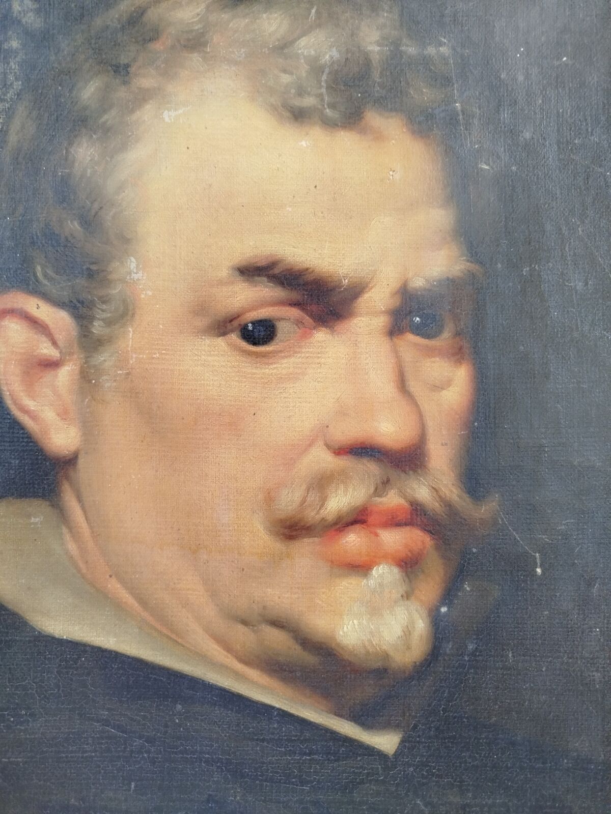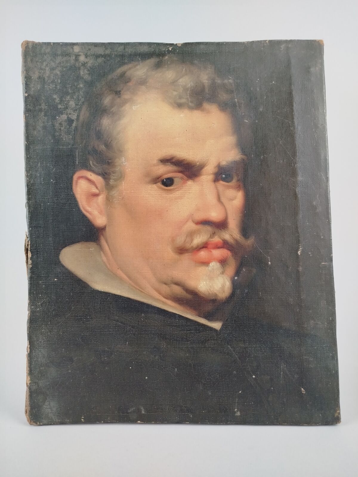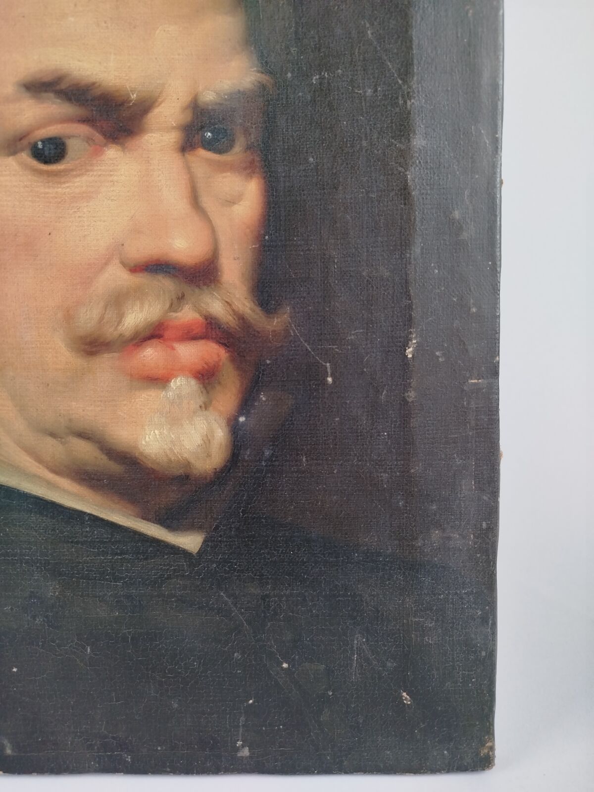 École espagnole vers 1800 d'après VELASQUEZ Portrait de Dom Juan Mateos ( mort en 1643) Toile d'origine Haut. : 38 cm ; Larg. : 30,5 cm. Reprise du portrait conservé à Munich, Gemalde der Älte Meister Expert : Cabinet TURQUIN - Stéphane PINTA.