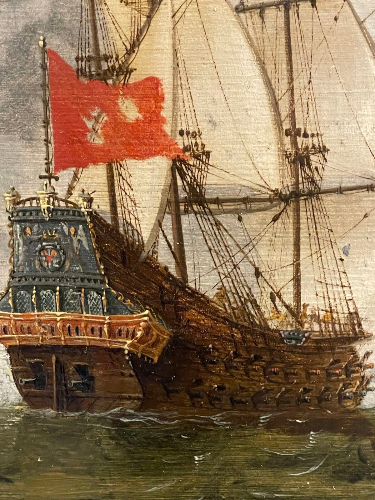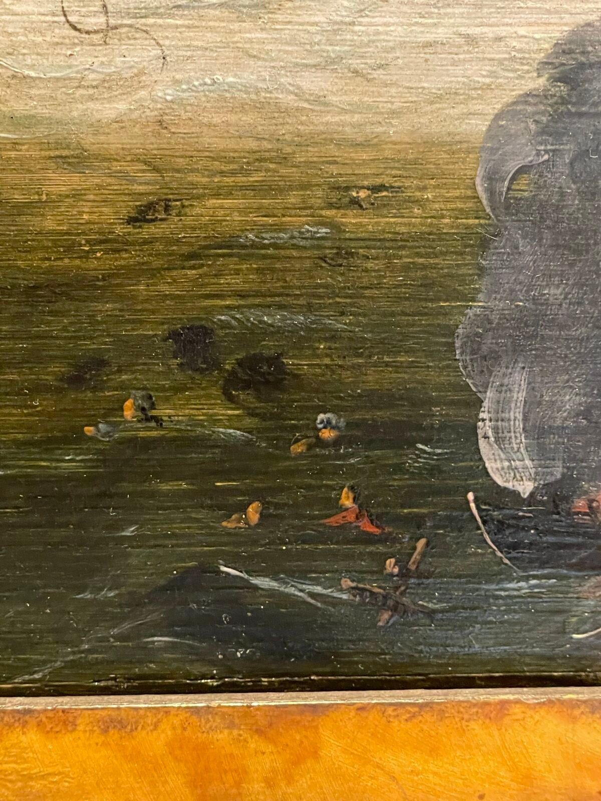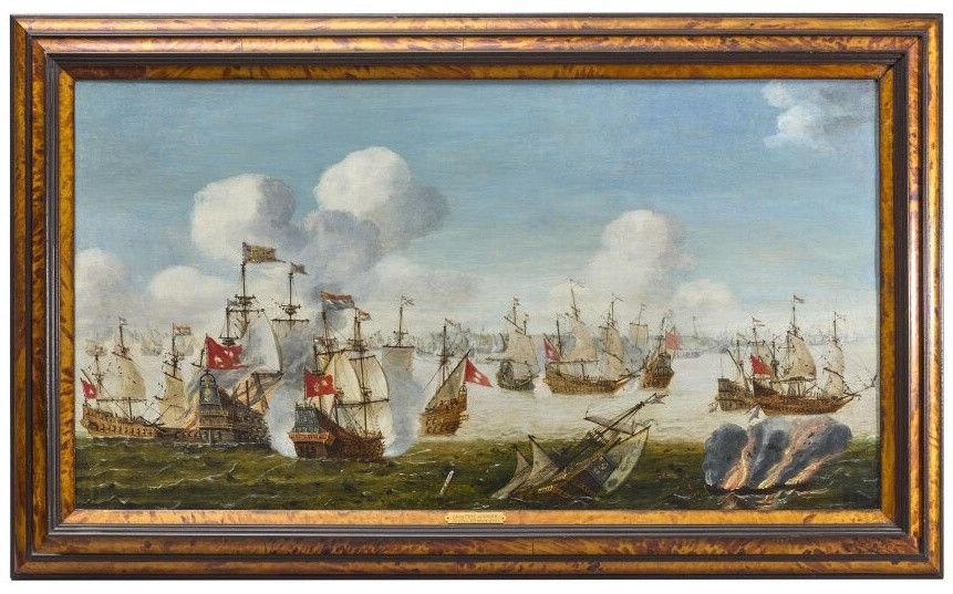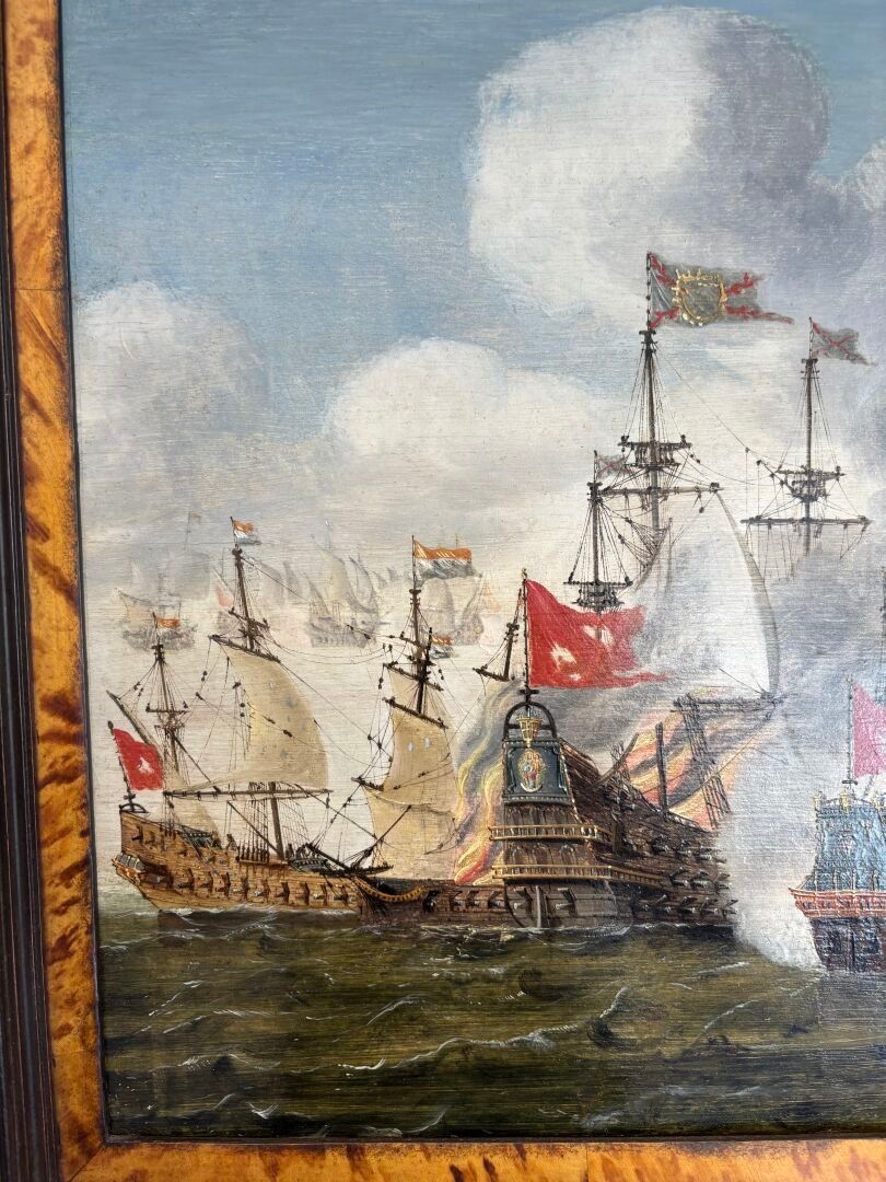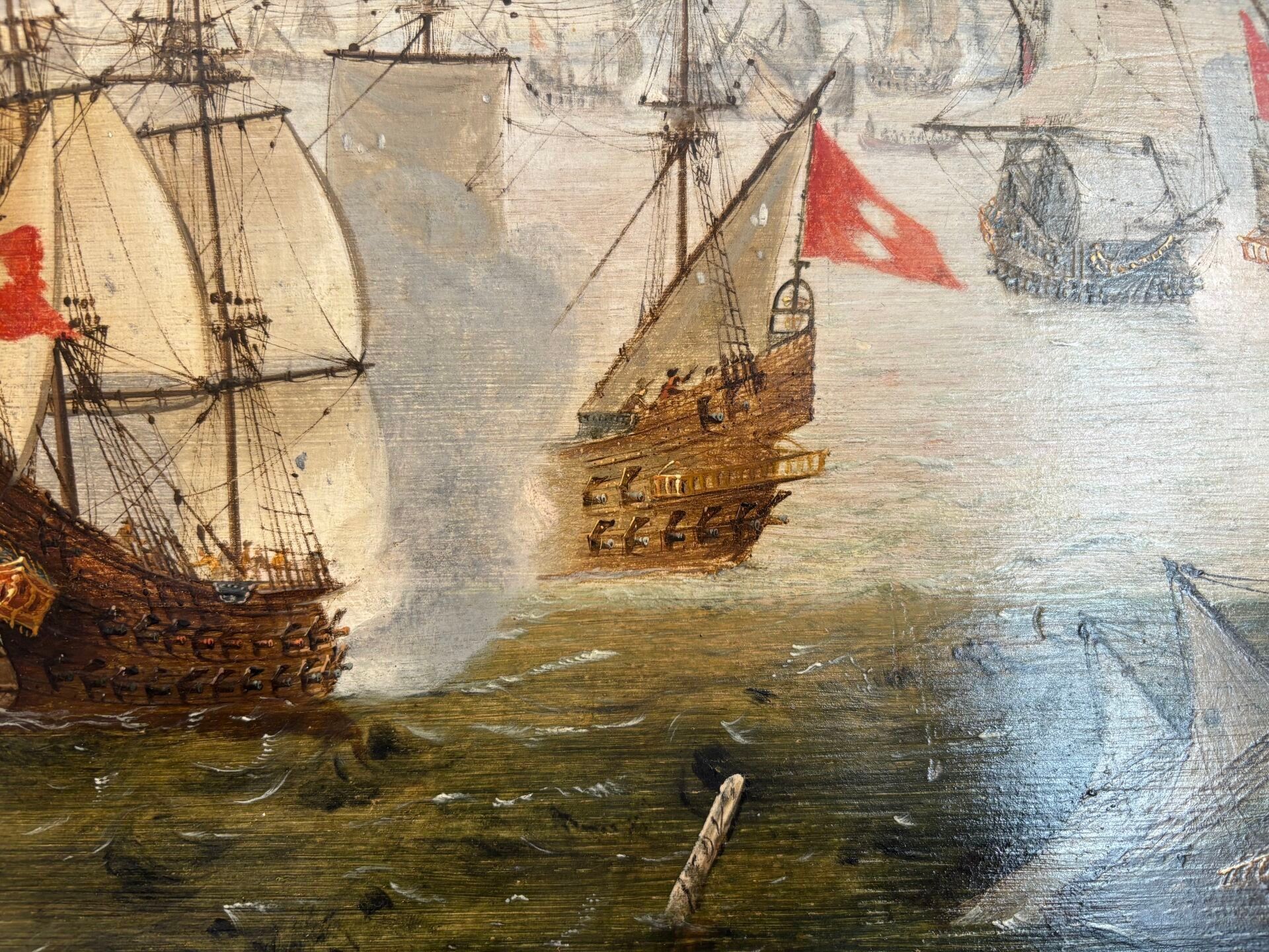 Jacob FEYT de VRIES (vers 1620-1644). La bataille des Downs le 21 octobre 1639. Panneau de chêne parqueté, signé du monogramme sur le morceau de bois flottant en bas au centre. (Restaurations anciennes.) Haut. : 50 cm ; Larg. : 93 cm. La bataille des Downs opposa les Hollandais aux Espagnols sous le commandement de Antonio de Oquendo. À tribord se trouve le navire amiral néerlandais Aemilia, sous le commandement de Maarten Harpertszoon Tromp. Nous remercions Monsieur Gillis Tak Labrijn pour son aide dans la description de notre tableau. Ce tableau possède un certificat d'authenticité du Professeur BOL, auteur de la Peinture hollandaise " Marines du XVIIe siècle ". Provenance : - Galerie Souffrice, quai Voltaire. Expert : Cabinet TURQUIN - Stéphane PINTA