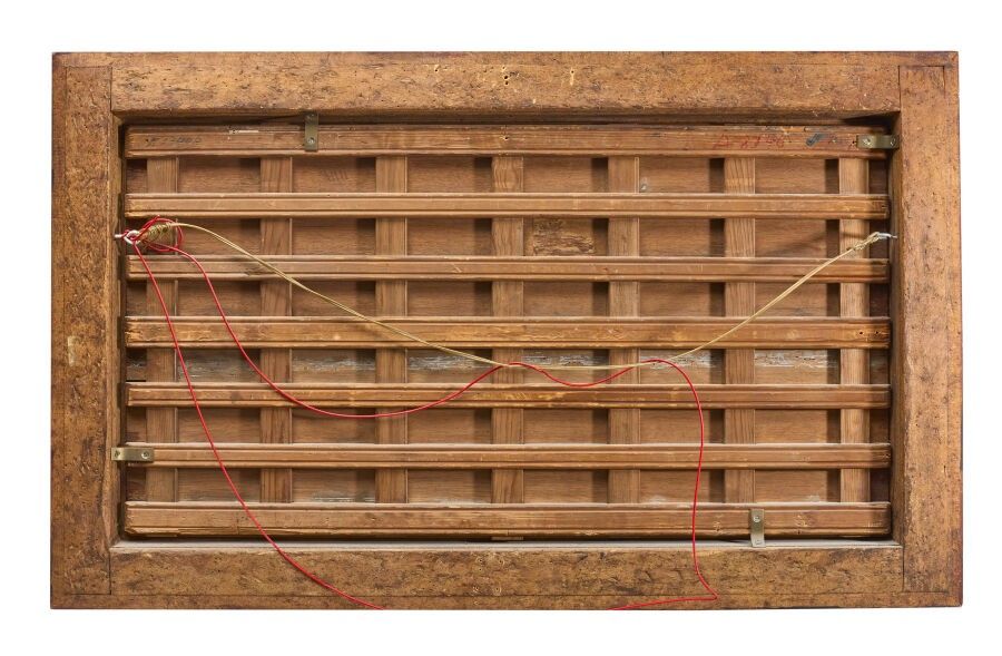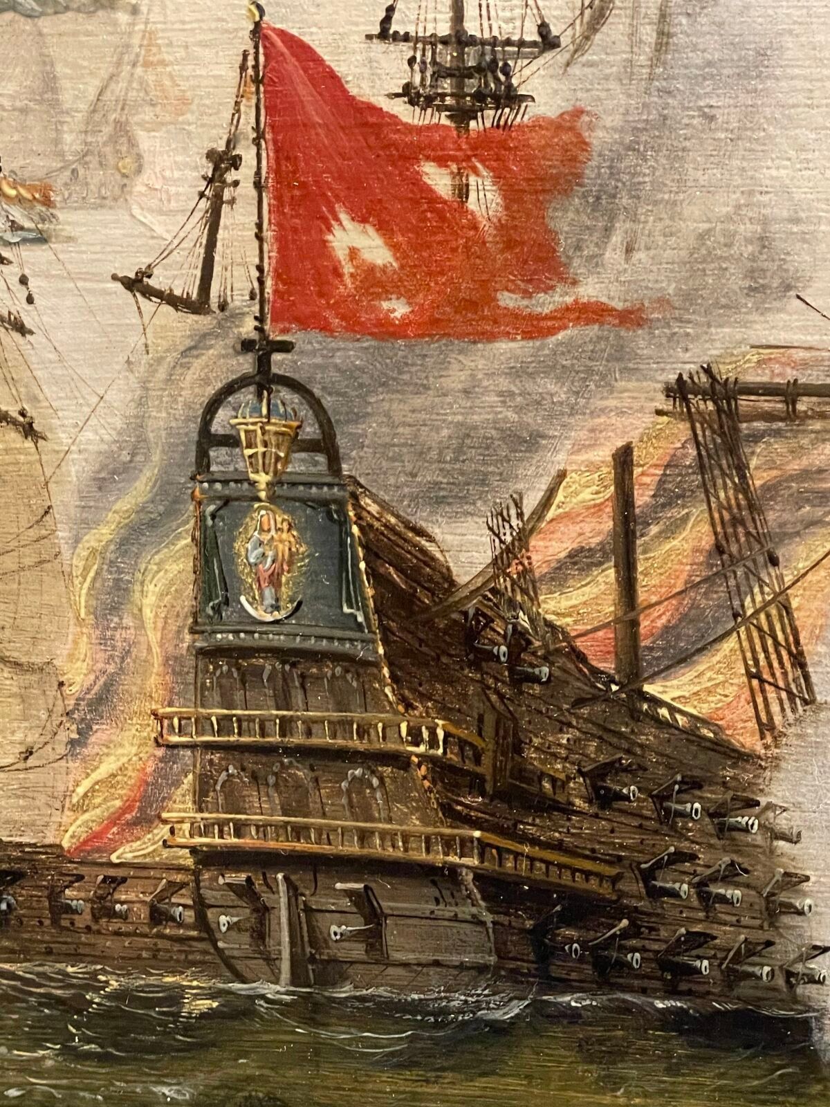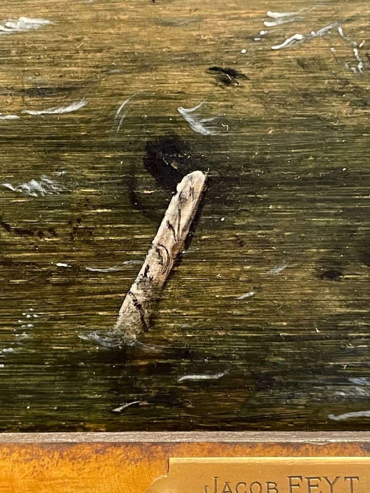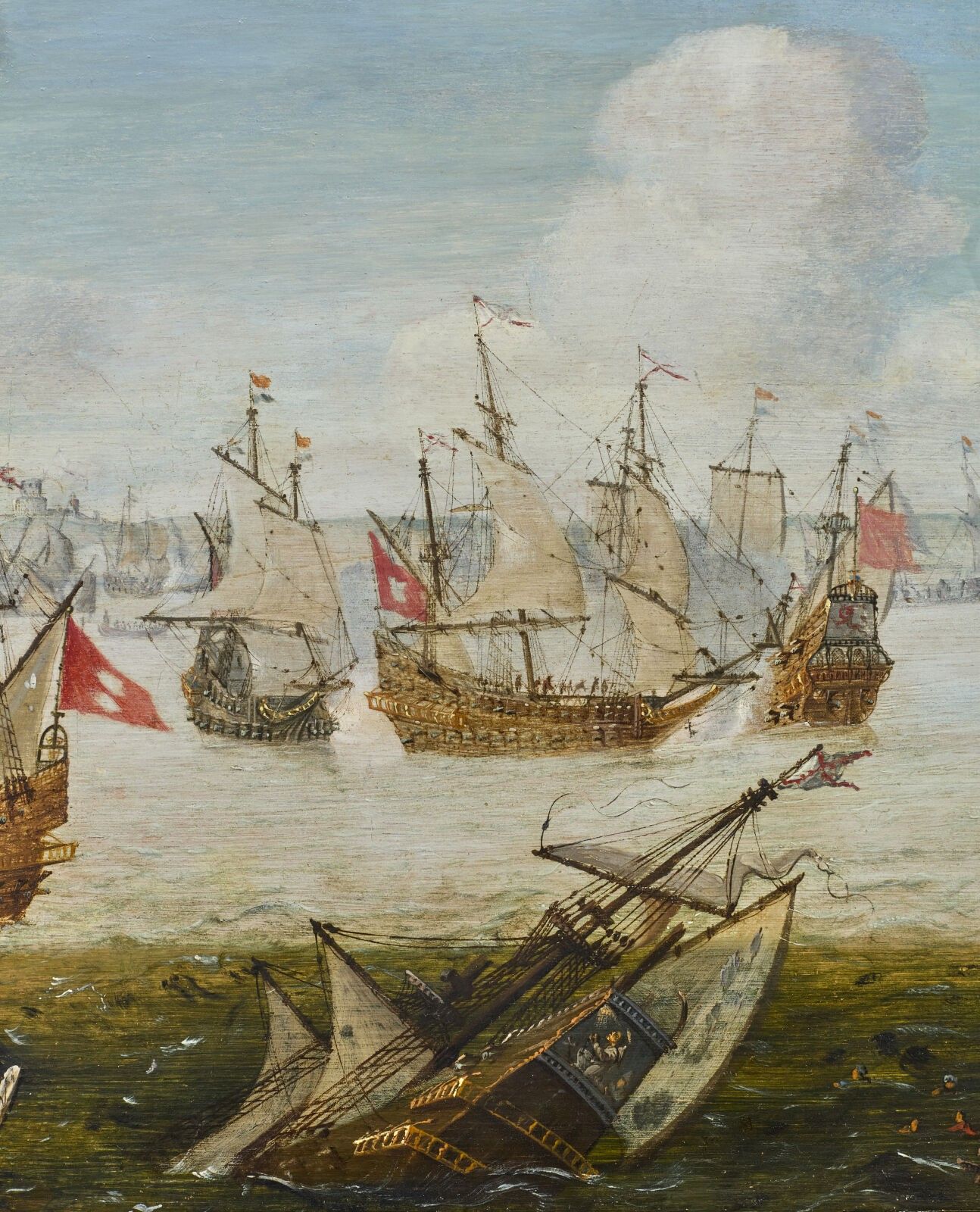 Jacob FEYT de VRIES (vers 1620-1644). La bataille des Downs le 21 octobre 1639. Panneau de chêne parqueté, signé du monogramme sur le morceau de bois flottant en bas au centre. (Restaurations anciennes.) Haut. : 50 cm ; Larg. : 93 cm. La bataille des Downs opposa les Hollandais aux Espagnols sous le commandement de Antonio de Oquendo. À tribord se trouve le navire amiral néerlandais Aemilia, sous le commandement de Maarten Harpertszoon Tromp. Nous remercions Monsieur Gillis Tak Labrijn pour son aide dans la description de notre tableau. Ce tableau possède un certificat d'authenticité du Professeur BOL, auteur de la Peinture hollandaise " Marines du XVIIe siècle ". Provenance : - Galerie Souffrice, quai Voltaire. Expert : Cabinet TURQUIN - Stéphane PINTA