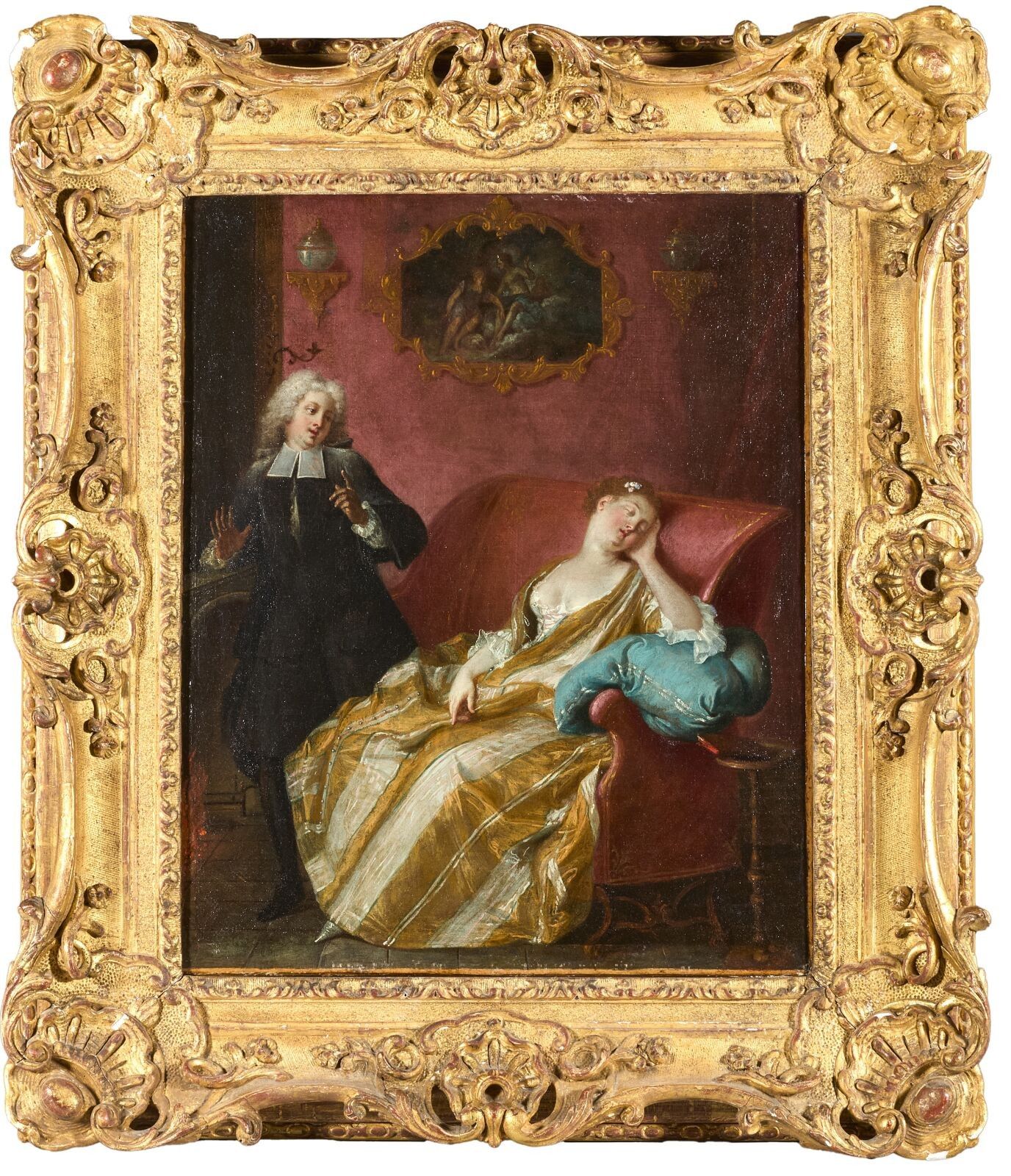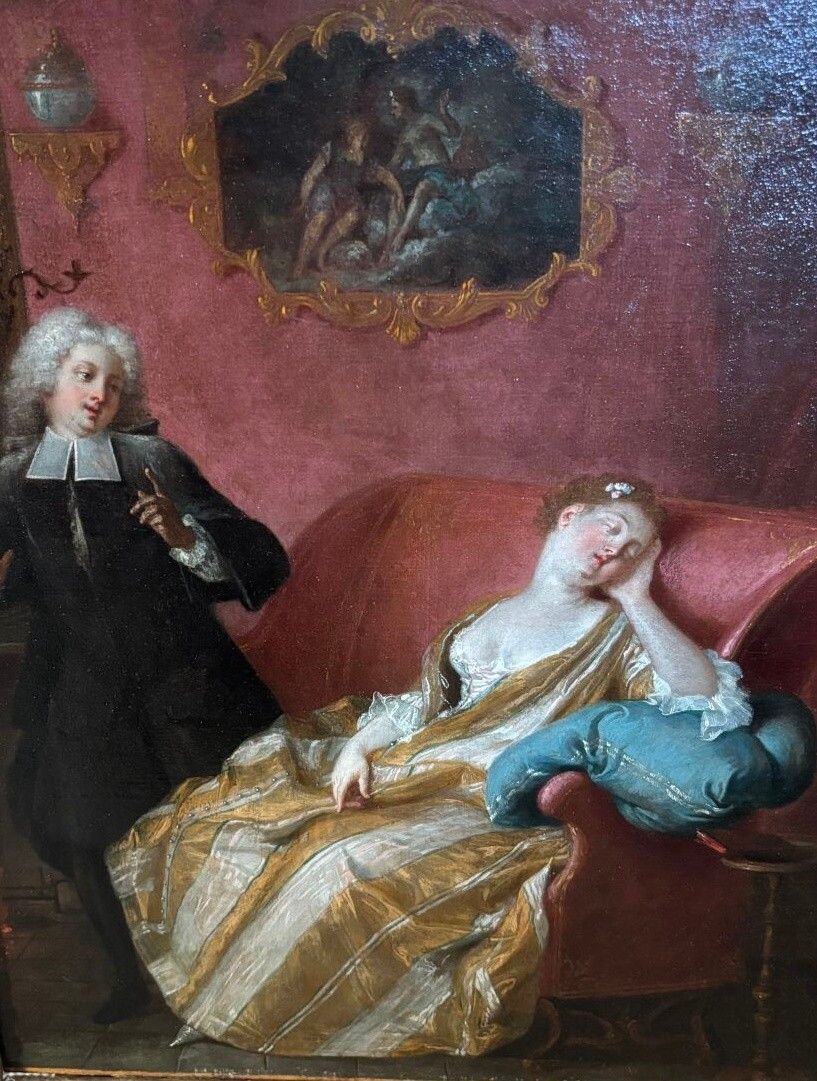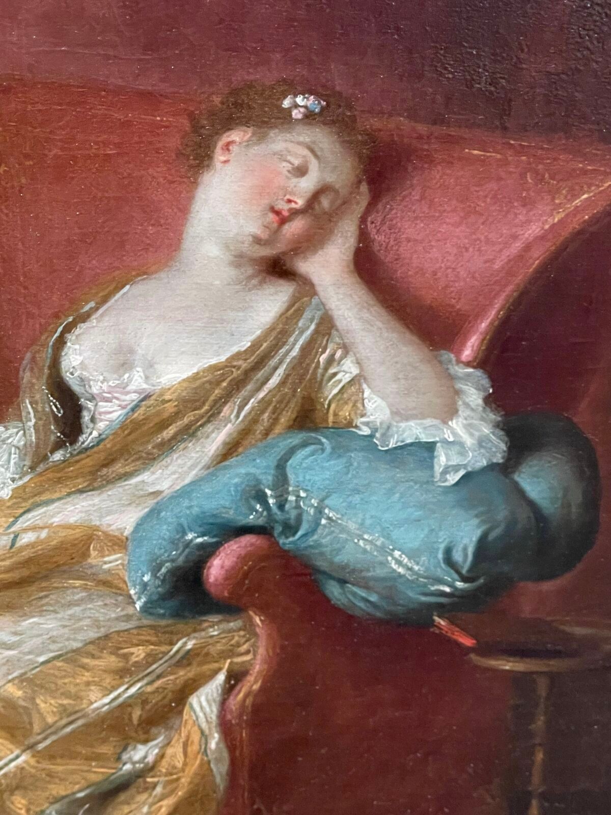 - Peut-être vente Remond, Paris, 6 juillet 1778, n° 72 : " J.B.F. de Troy. Une dame endormie sur un canapé, un homme de robe la regarde ; ce tableau peint sur toile porte 16 pouces de haut, sur 13 de large " ( H: 0.43 ; L: 0.35).