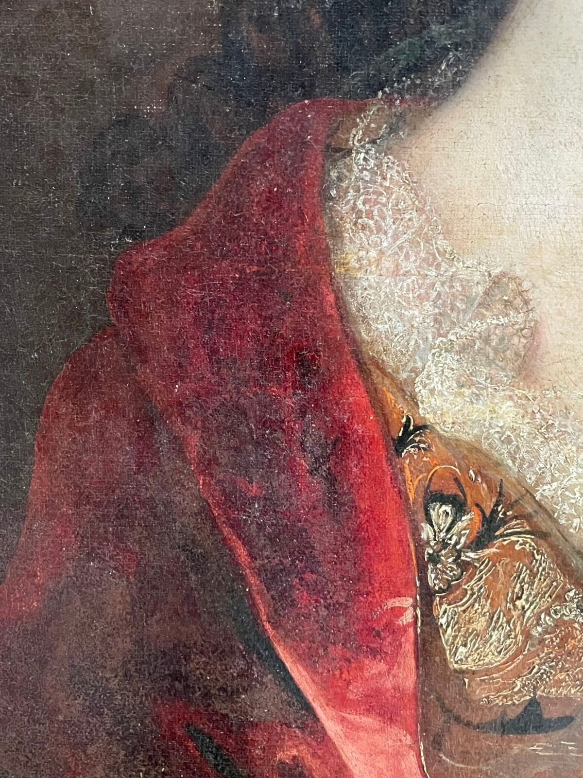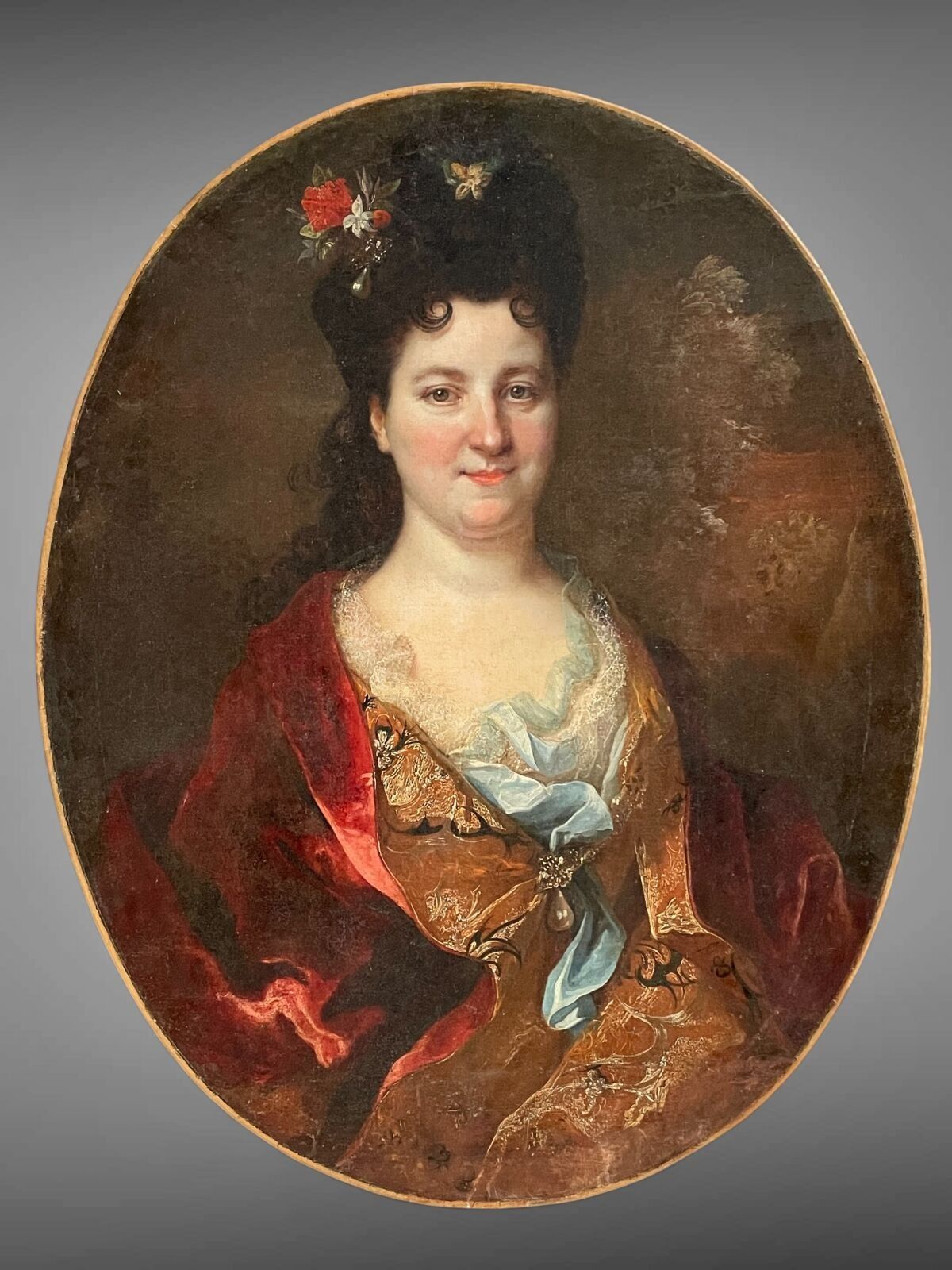 Attribué à Nicolas de LARGILLIERRE (1656 - 1746) Portrait de dame au manteau rouge Toile ovale Haut. : 81 cm ; Larg. : 64,5 cm Expert : Cabinet TURQUIN - Stéphane PINTA.