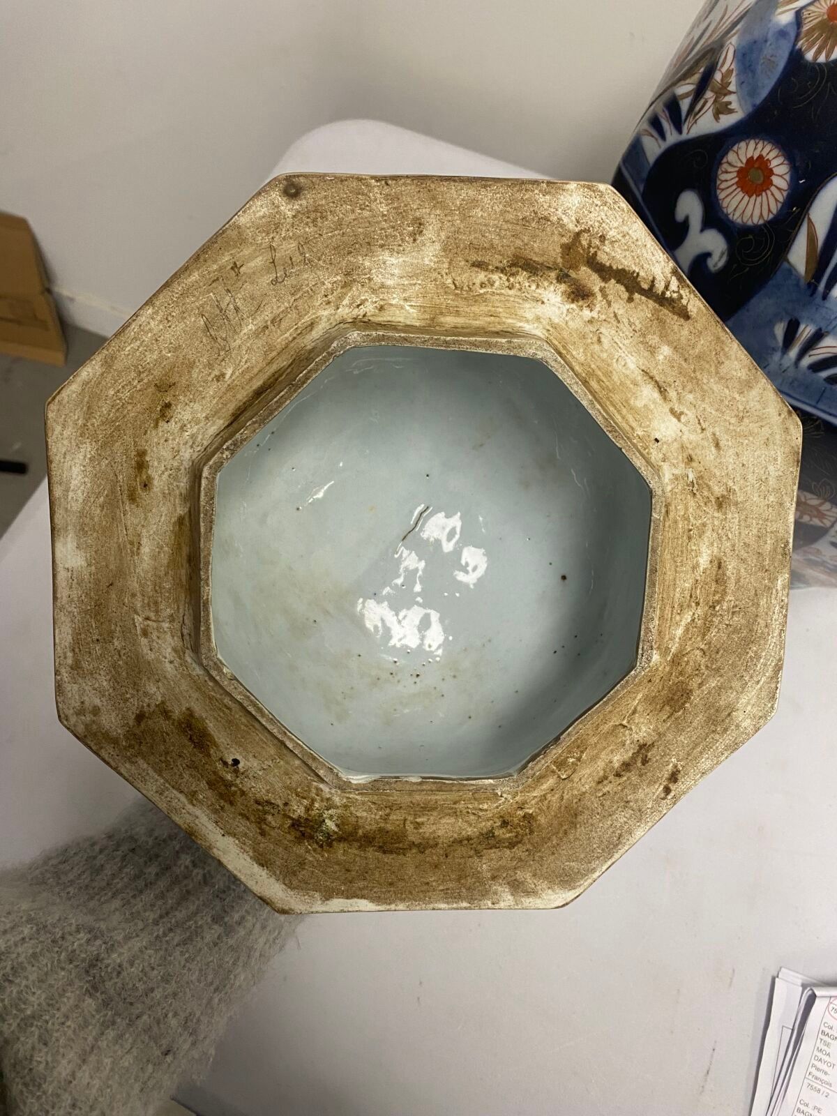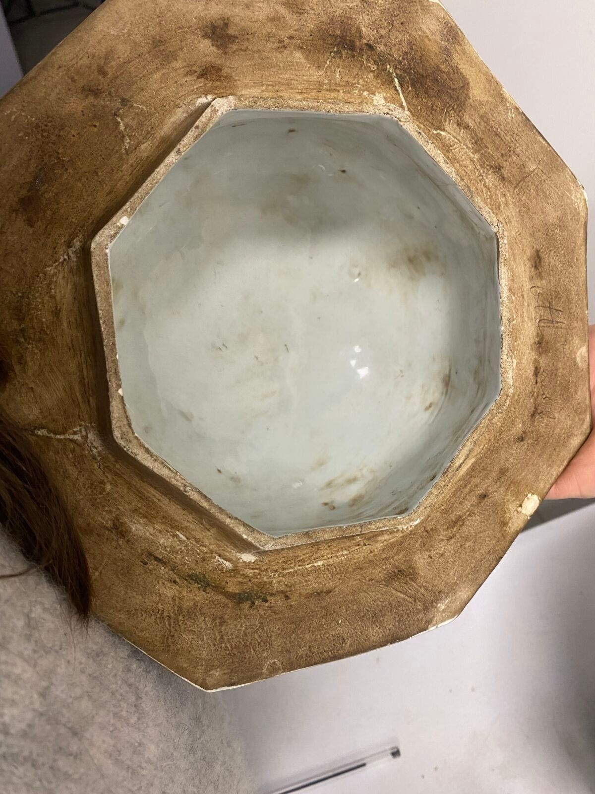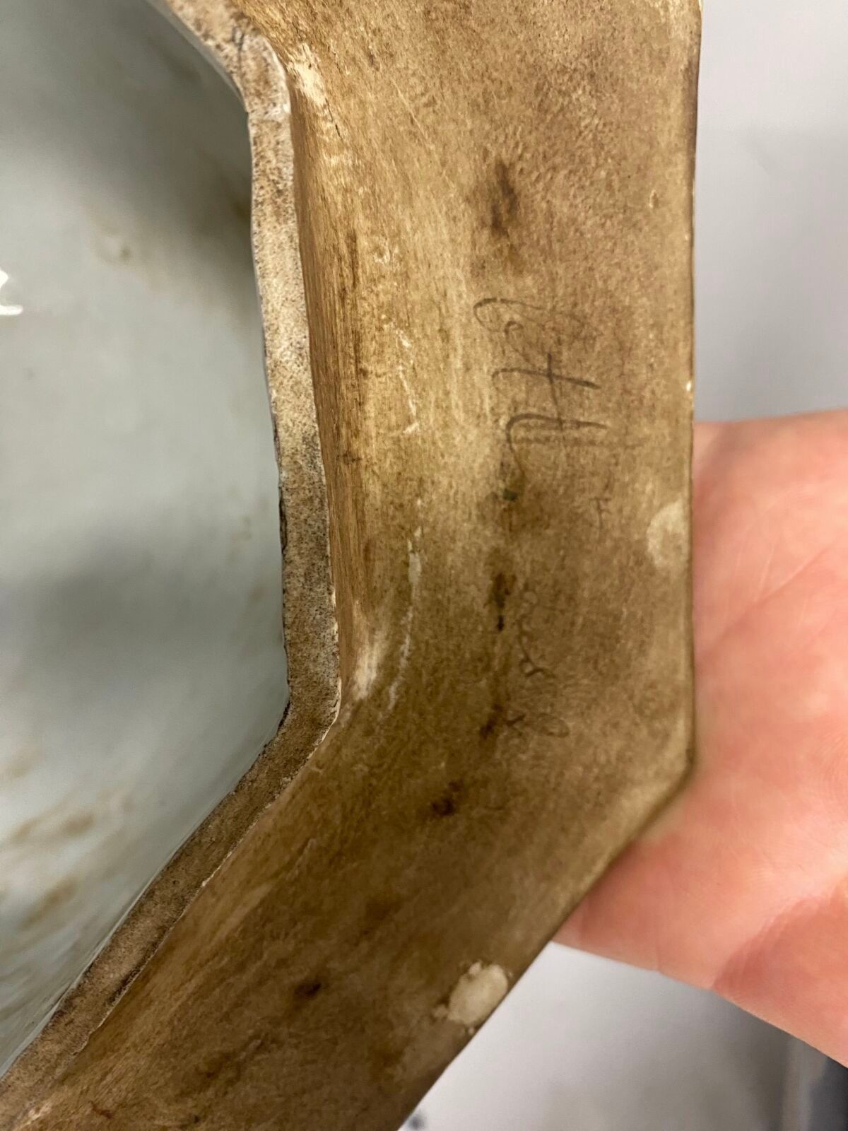 (Éclats, restaurations, fêlure au-dessous, fonds percés.)