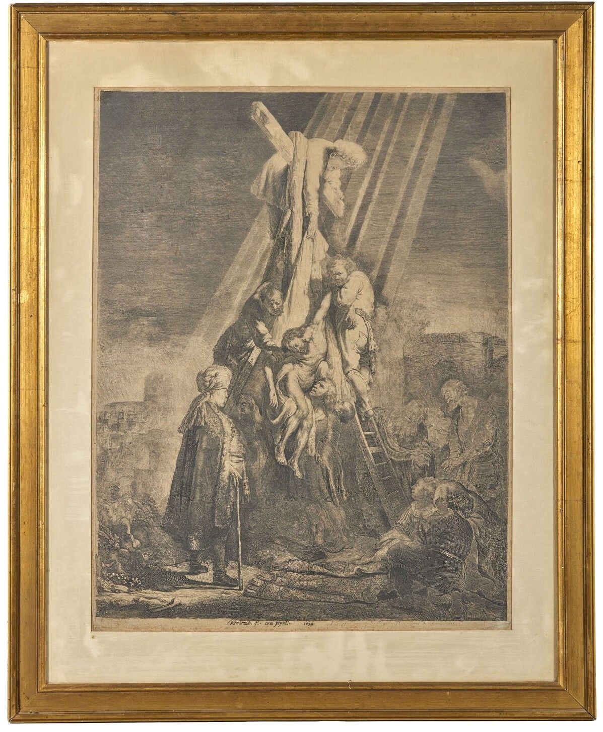 La Grande descente de croix. 1933. Eau-forte et burin. L. 410 x H. 530 mm. Bartsch 81. Bonne épreuve d'un tirage tardif de Basan (tout début XIXe), sur vergé, l'adresse de Danckers non encrée mais perceptible, le visage de l'homme perché sur la croix très affaibli. Oxydation générale et empoussiérage. Marges. Cadre (non examinée hors du cadre).