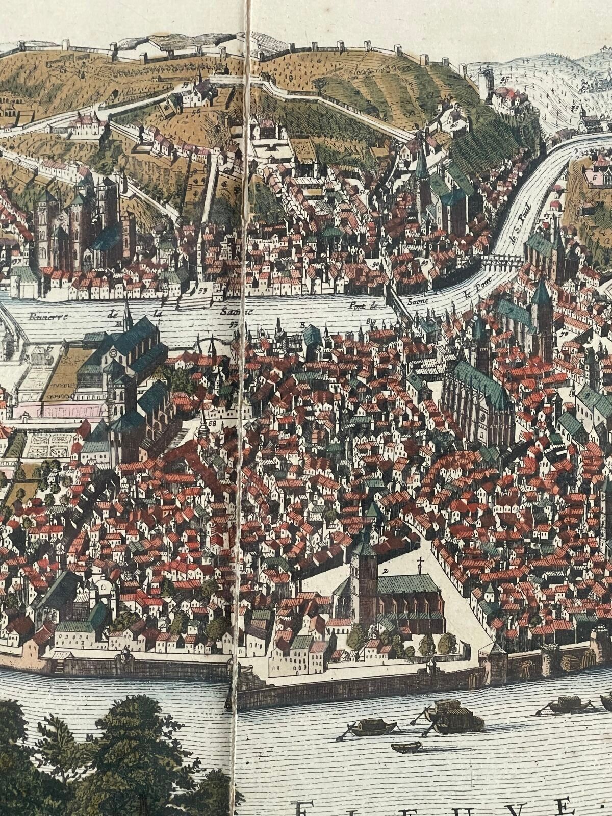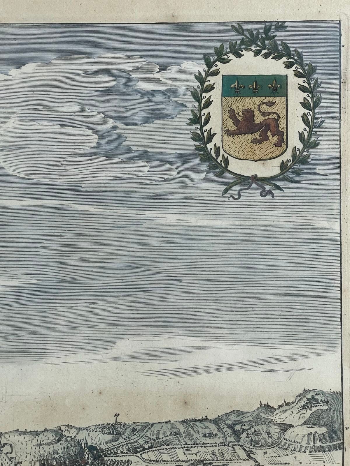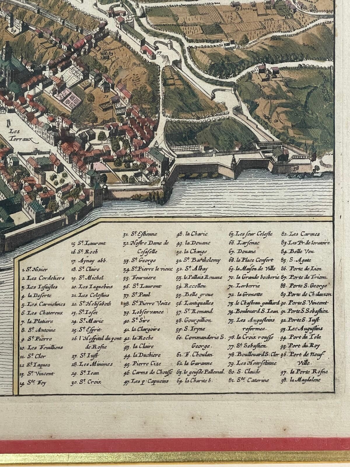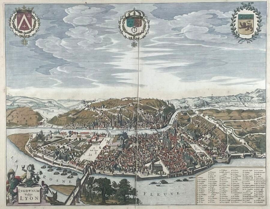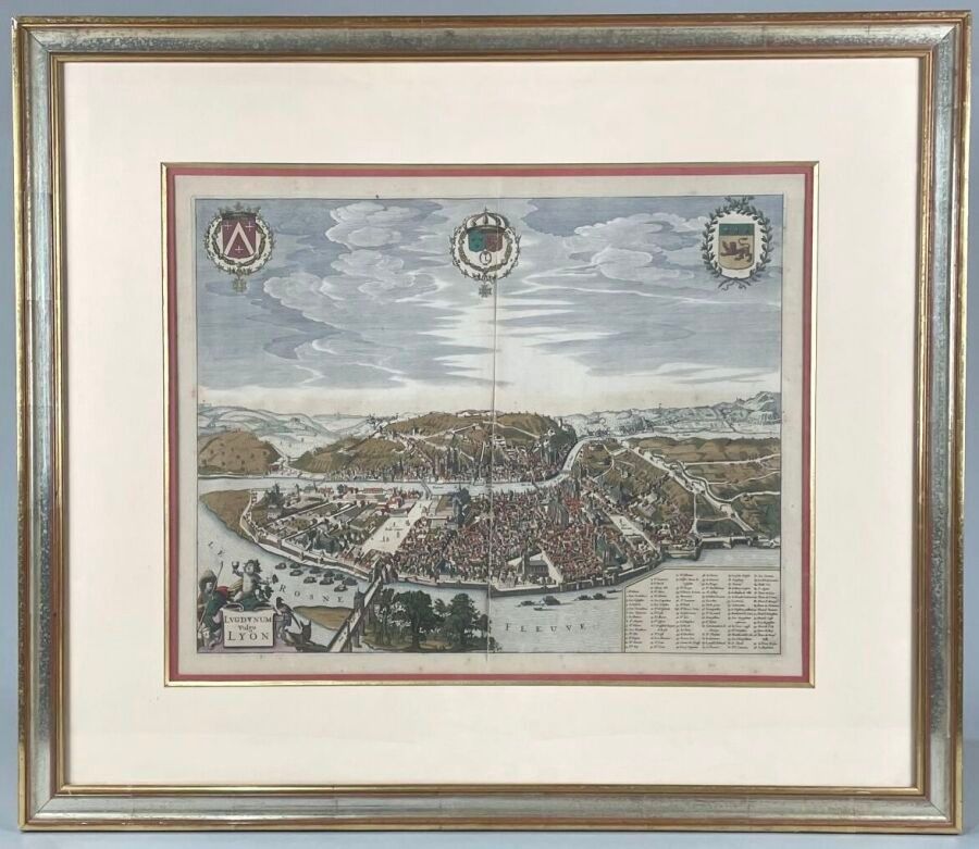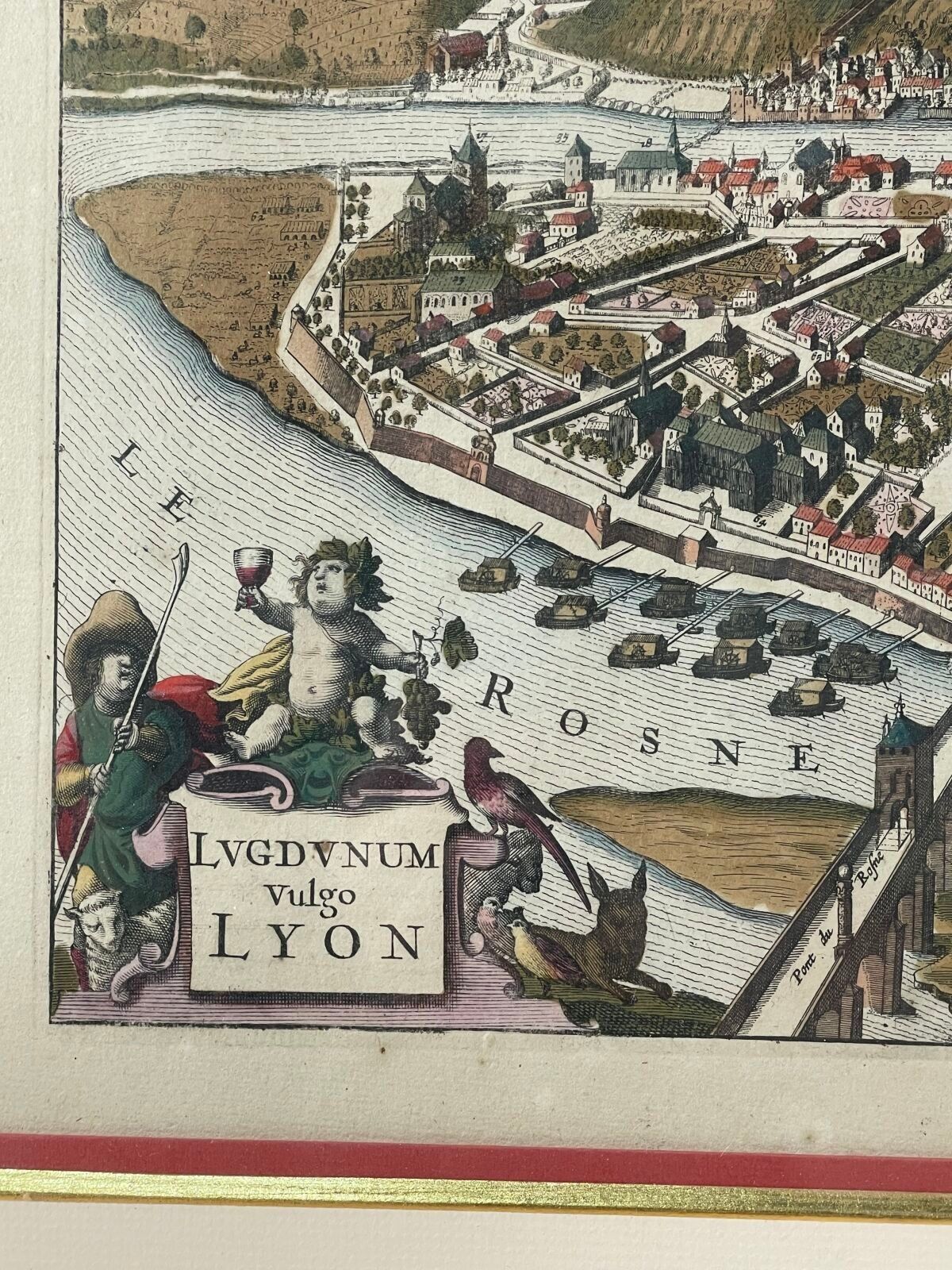 LYON - D'après Simon MAUPIN, vers 1600-1668 : Description au naturel de la ville de Lyon et alentour d'icelle. Plan gravé entièrement rehaussé à l'aquarelle.