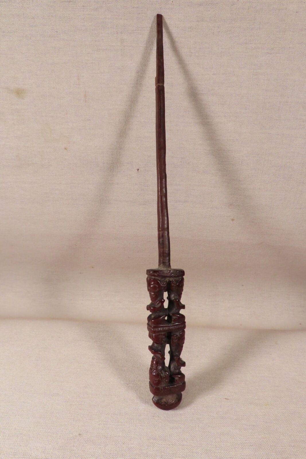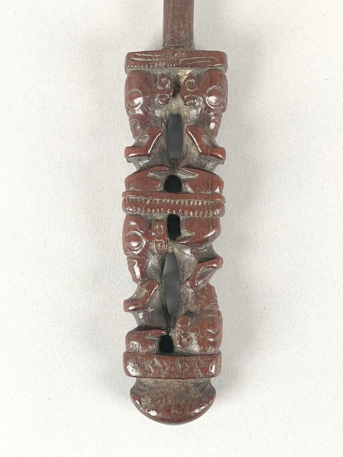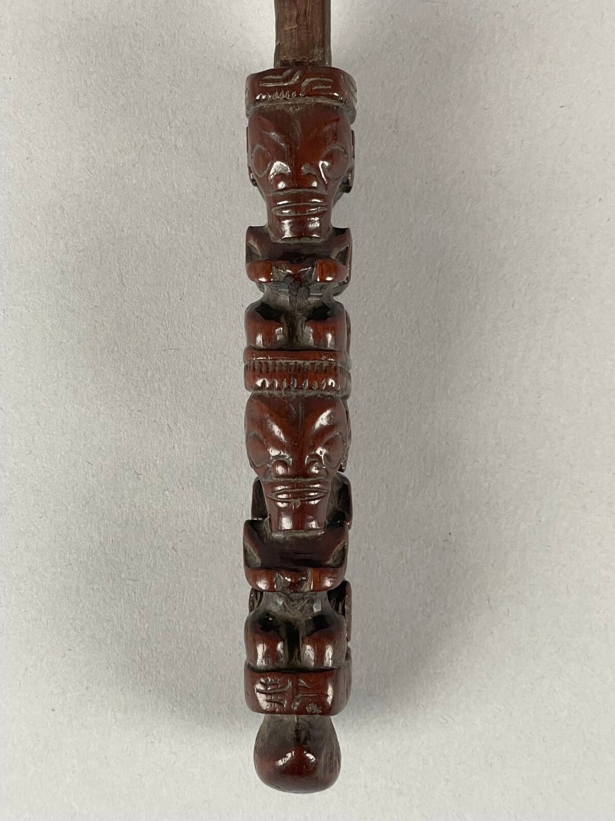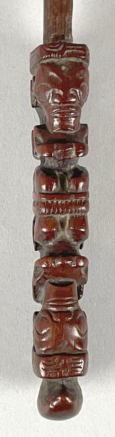 Manche en bois dont la poignée ajourée est sculptée de la représentation de quatre Tiki en pied, l'un d'entre eux étant figuré à l'envers. Objet cérémoniel de prestige, il était utilisé à l'origine pour éventer les chefs ou les notables.
