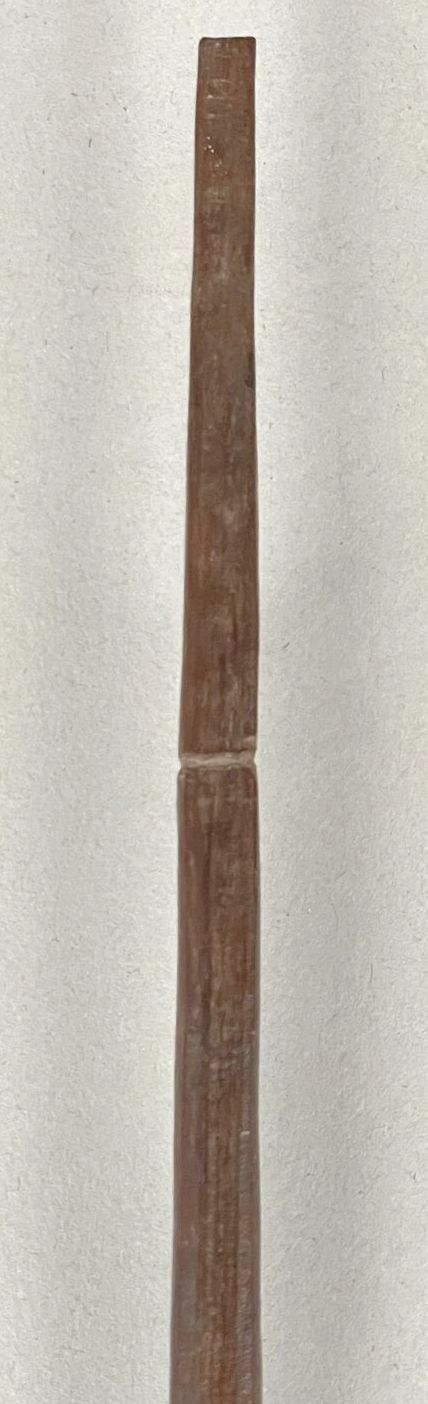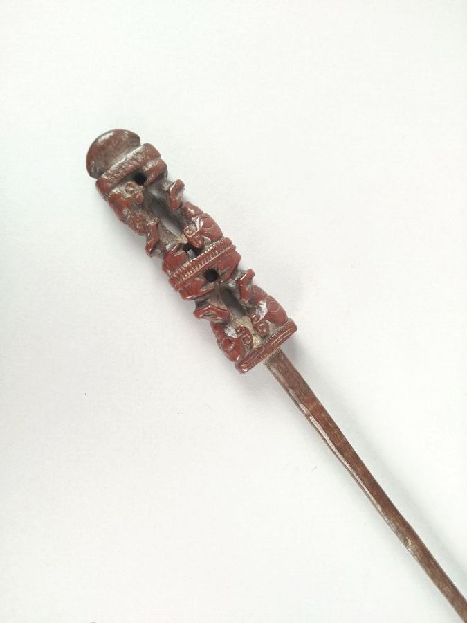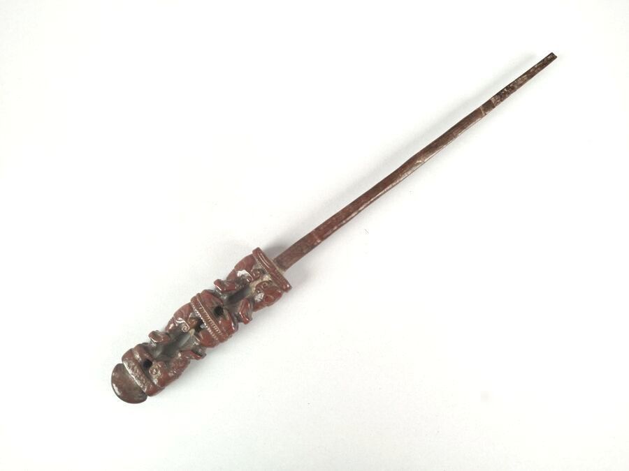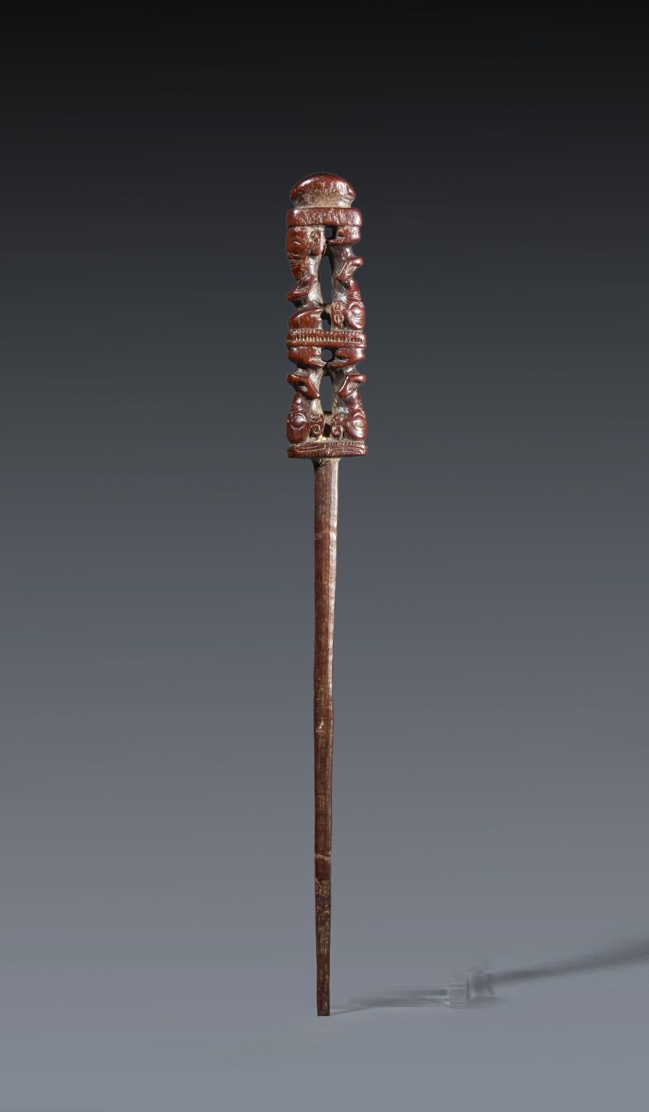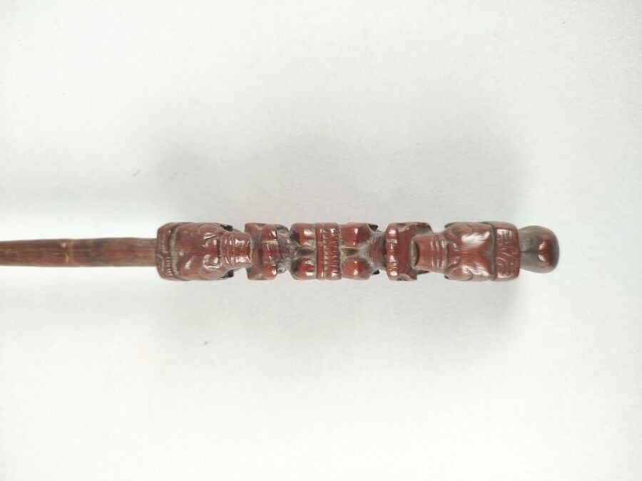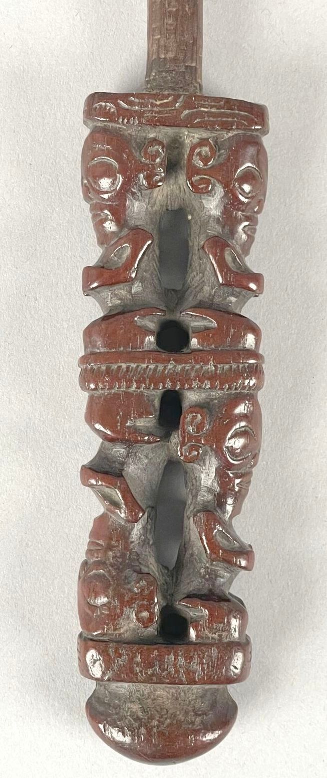 Manche en bois dont la poignée ajourée est sculptée de la représentation de quatre Tiki en pied, l'un d'entre eux étant figuré à l'envers. Objet cérémoniel de prestige, il était utilisé à l'origine pour éventer les chefs ou les notables.