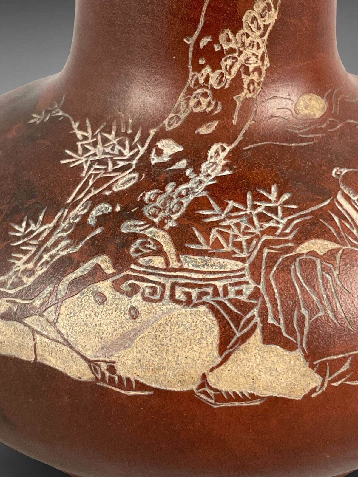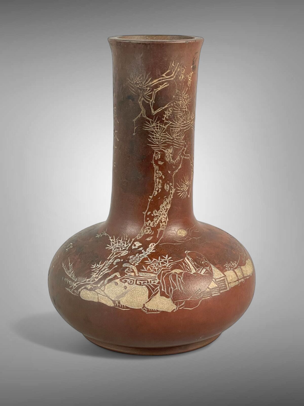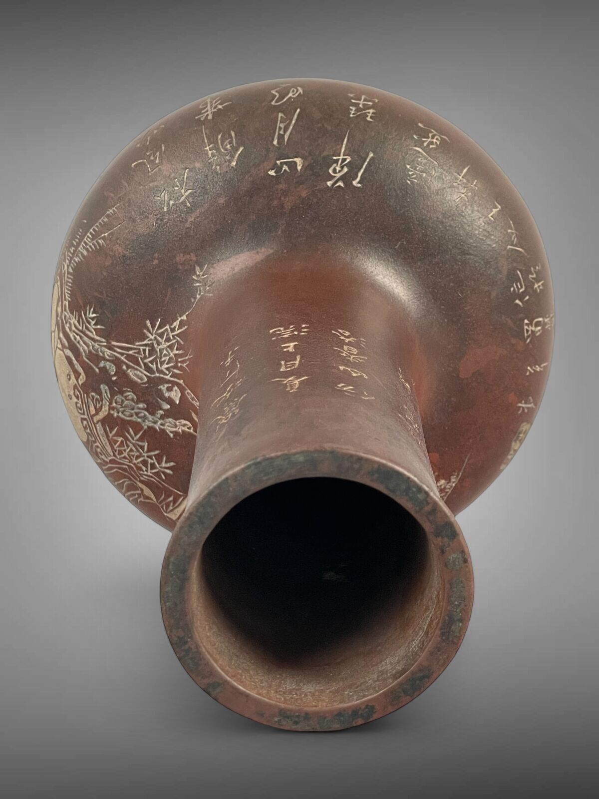 Vase à panse basse à long col en grès à décor incisé d'un lettré sous un pin et poème.