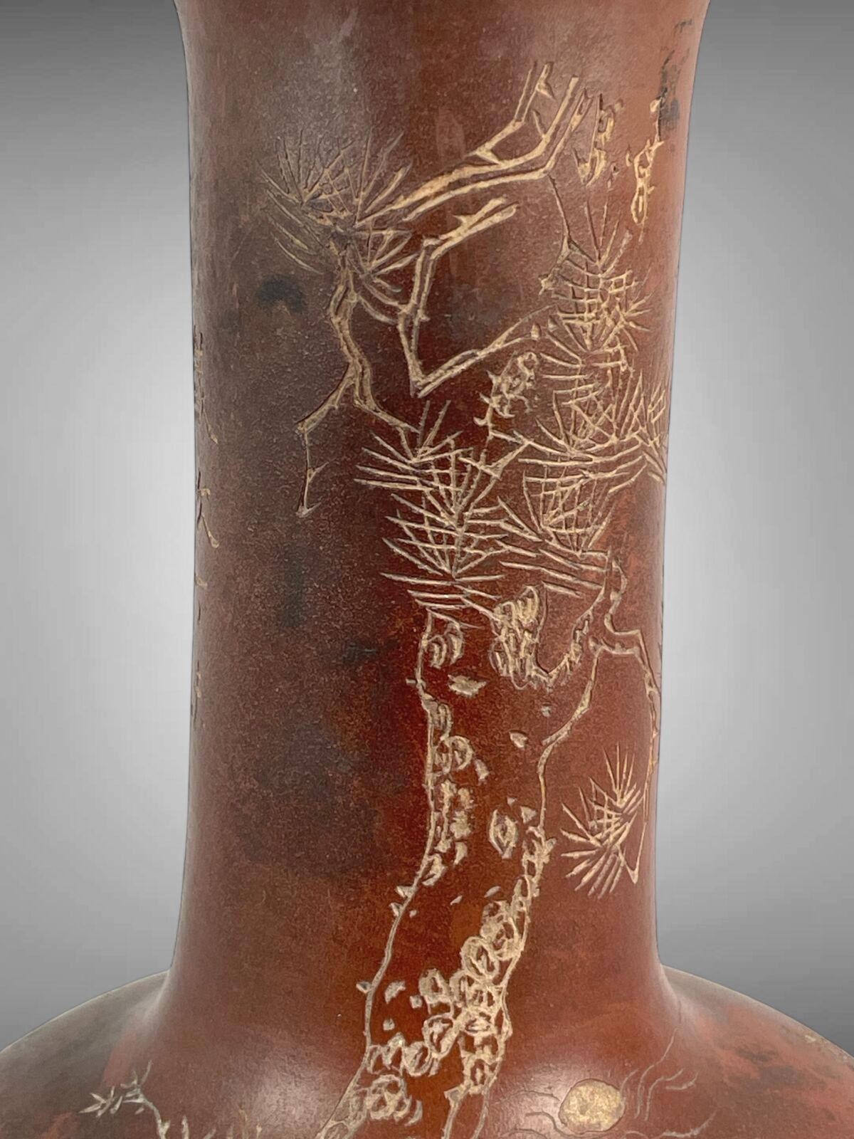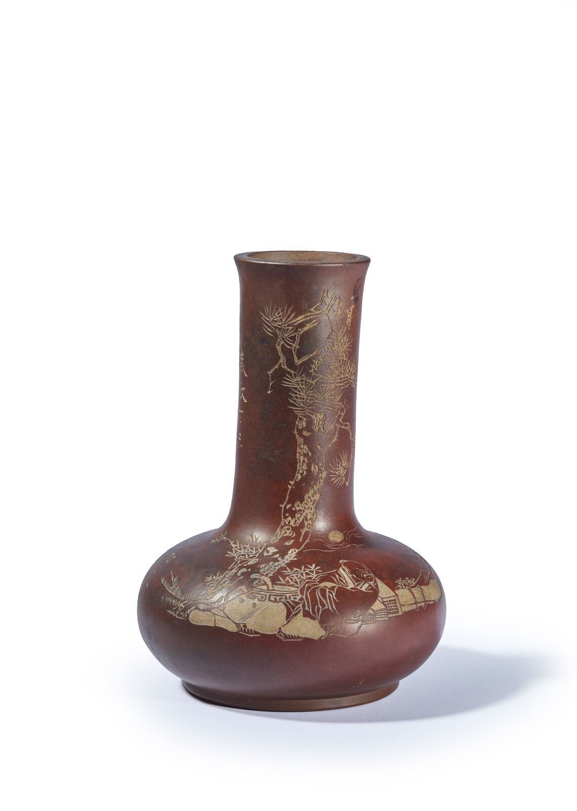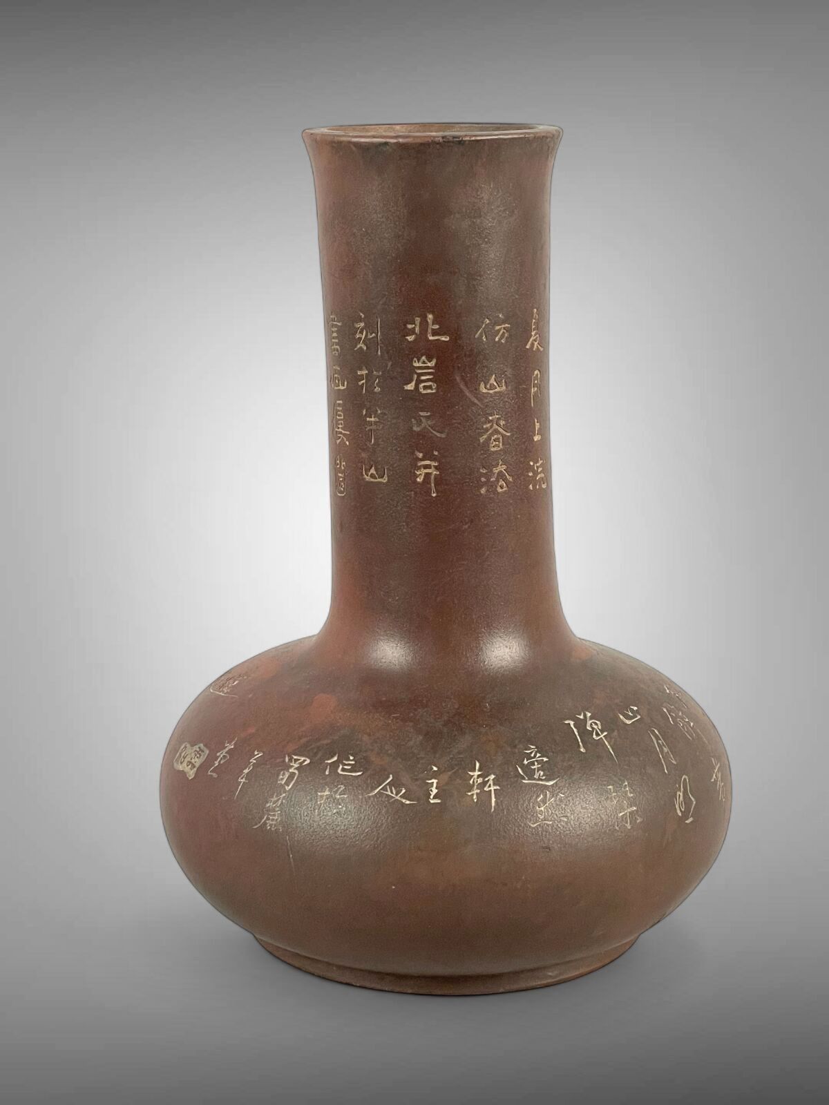 Vase à panse basse à long col en grès à décor incisé d'un lettré sous un pin et poème.