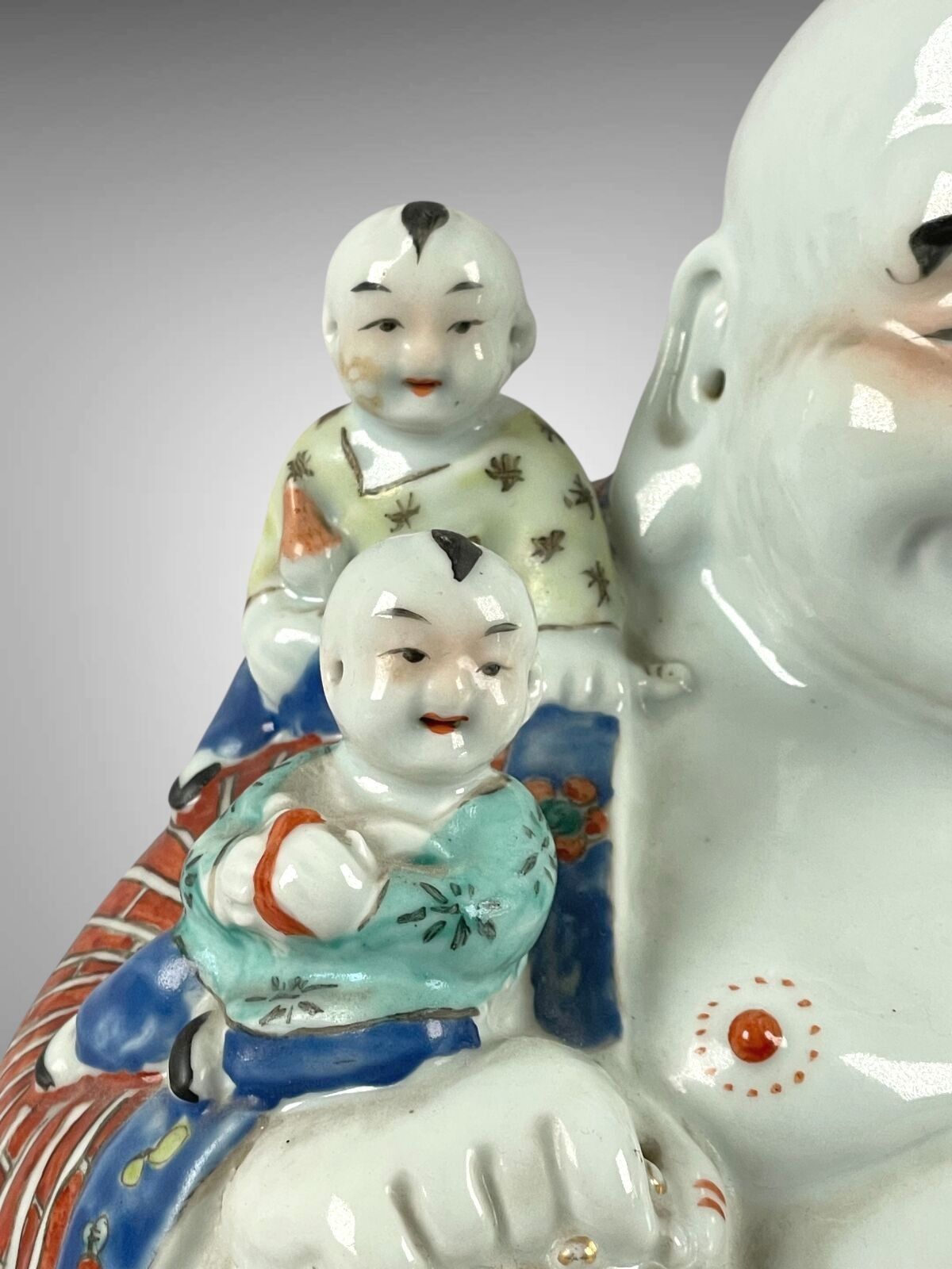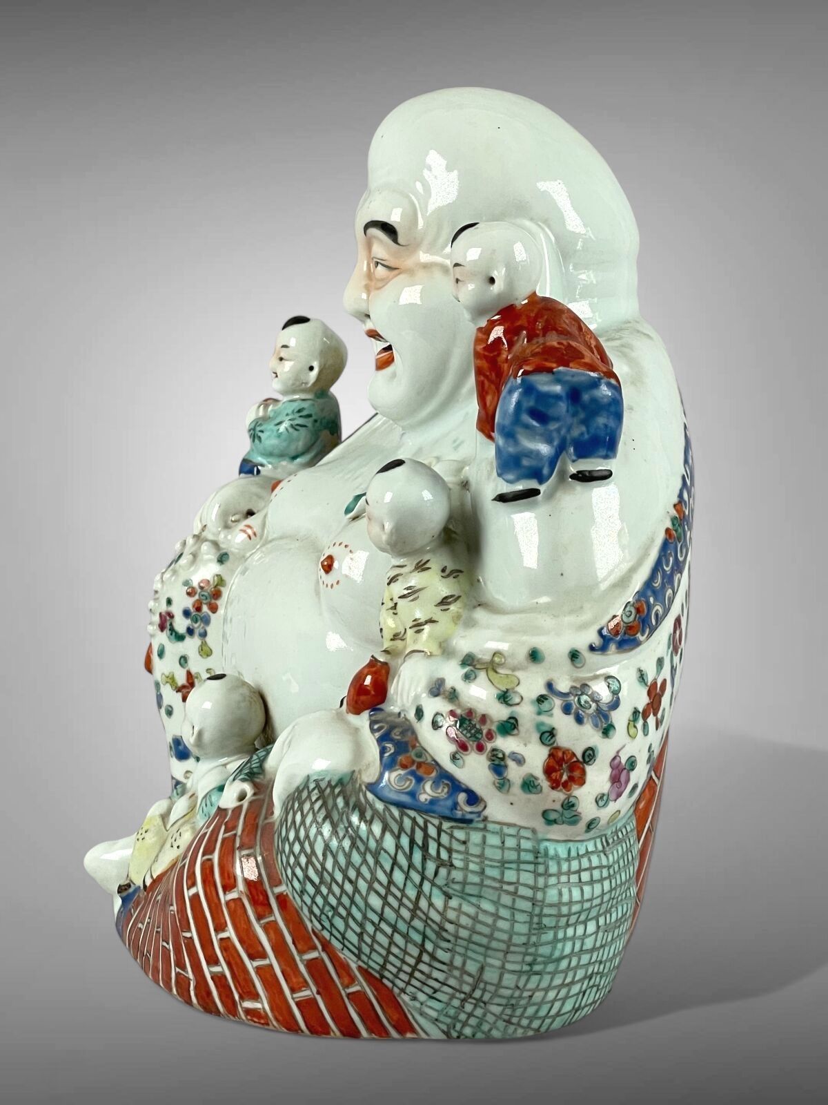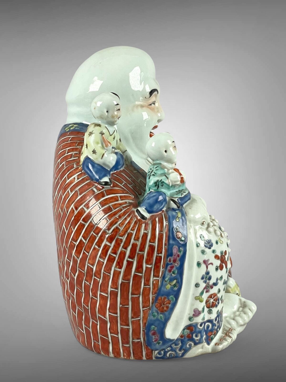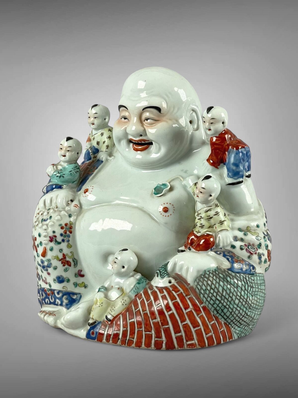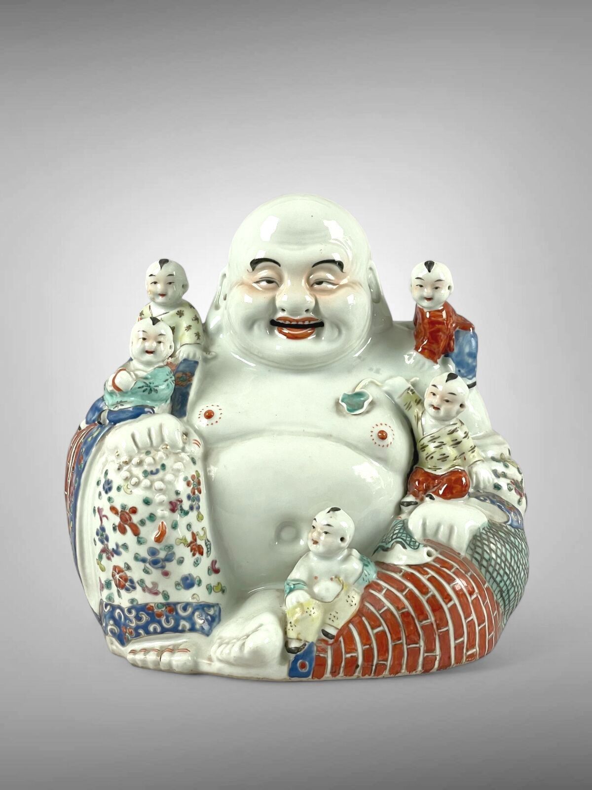 Budai en porcelaine émaillée polychrome et or assis en lalitasana entouré de cinq enfants grimpés sur ses genoux. Cachet Jiangxi Mao ji Zhu zao au revers.