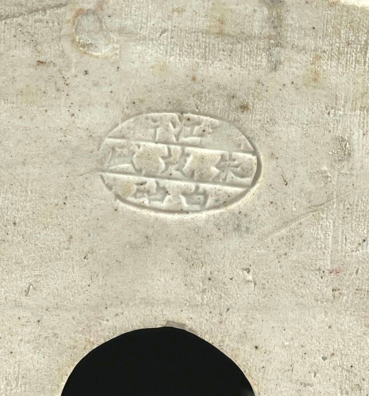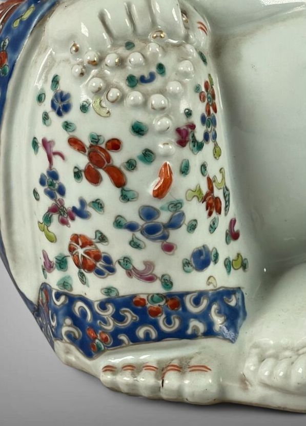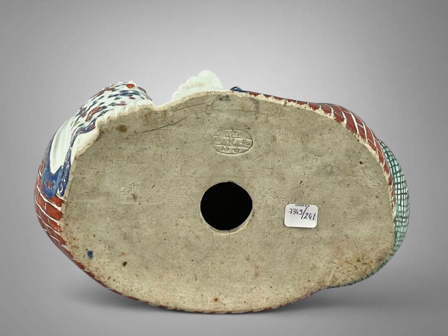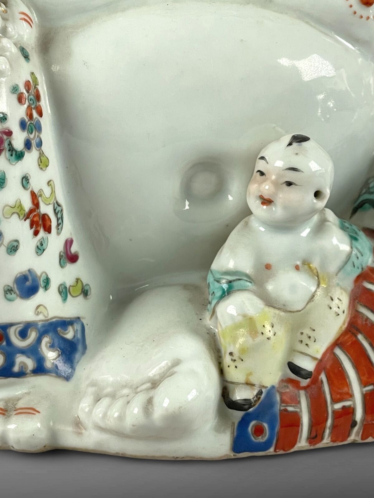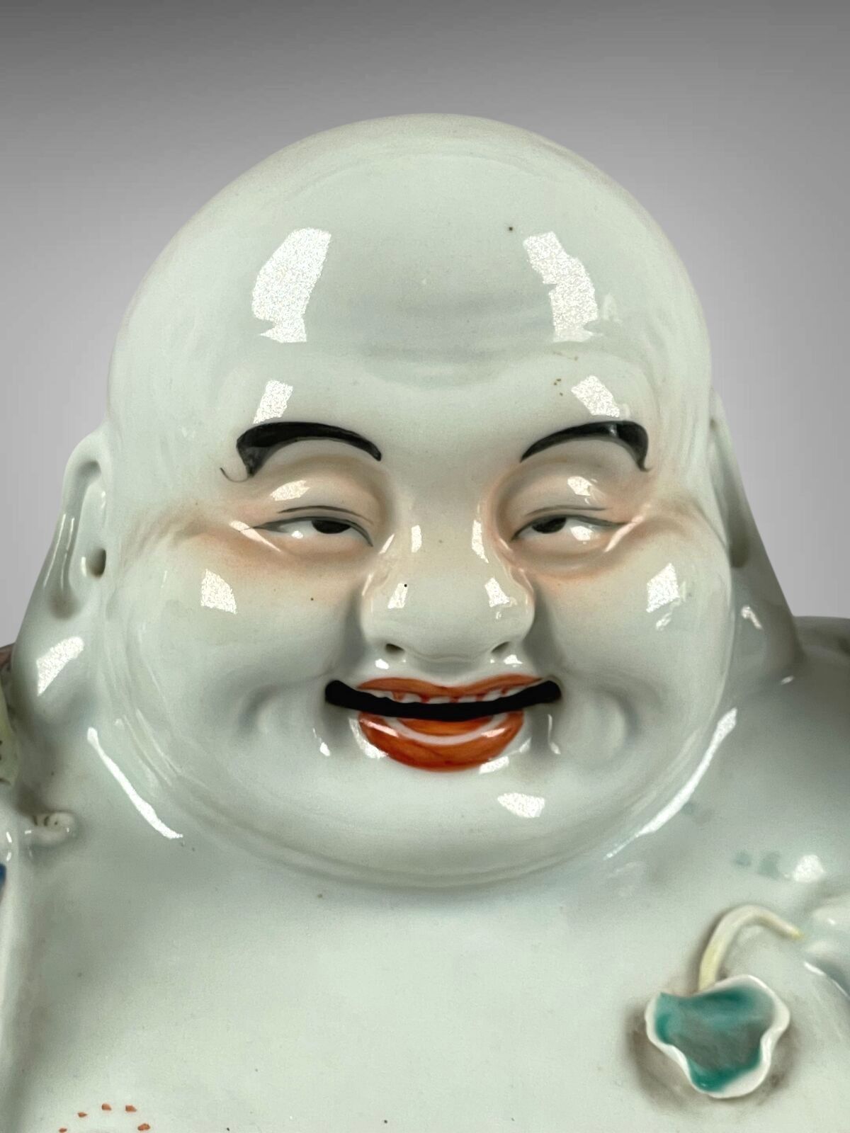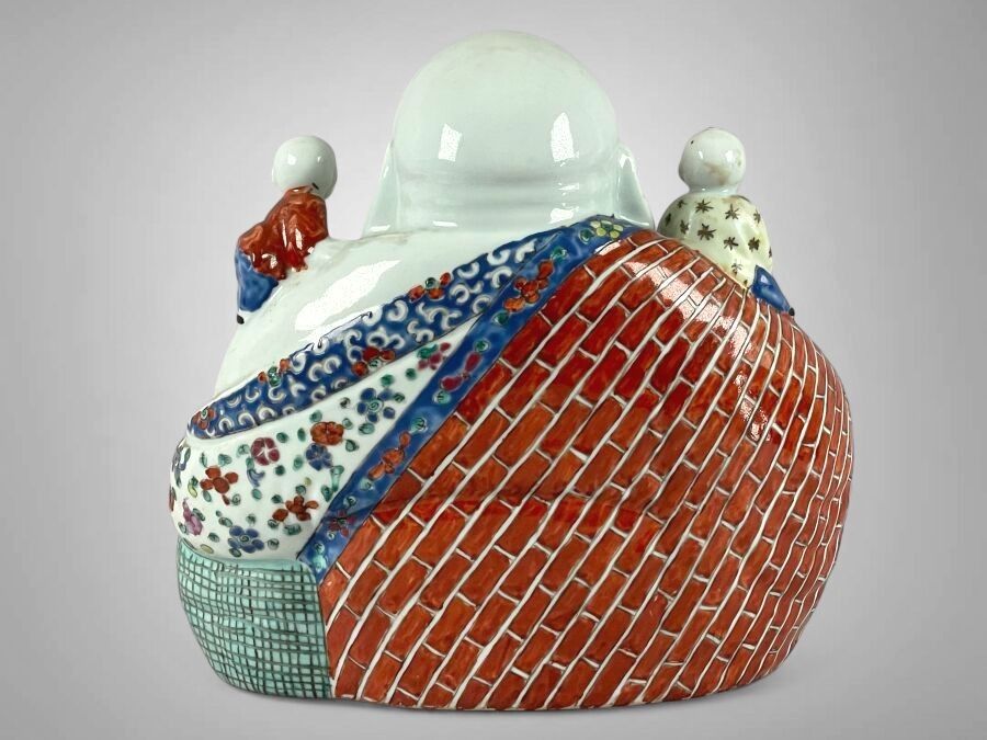 Budai en porcelaine émaillée polychrome et or assis en lalitasana entouré de cinq enfants grimpés sur ses genoux. Cachet Jiangxi Mao ji Zhu zao au revers.