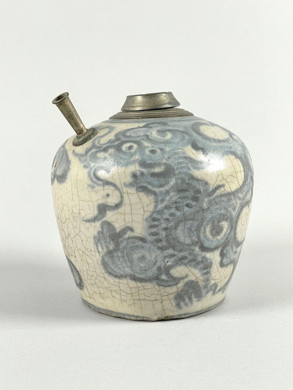 Pipe à eau en porcelaine à décor en bleu sous couverte de dragon dans les nuées.