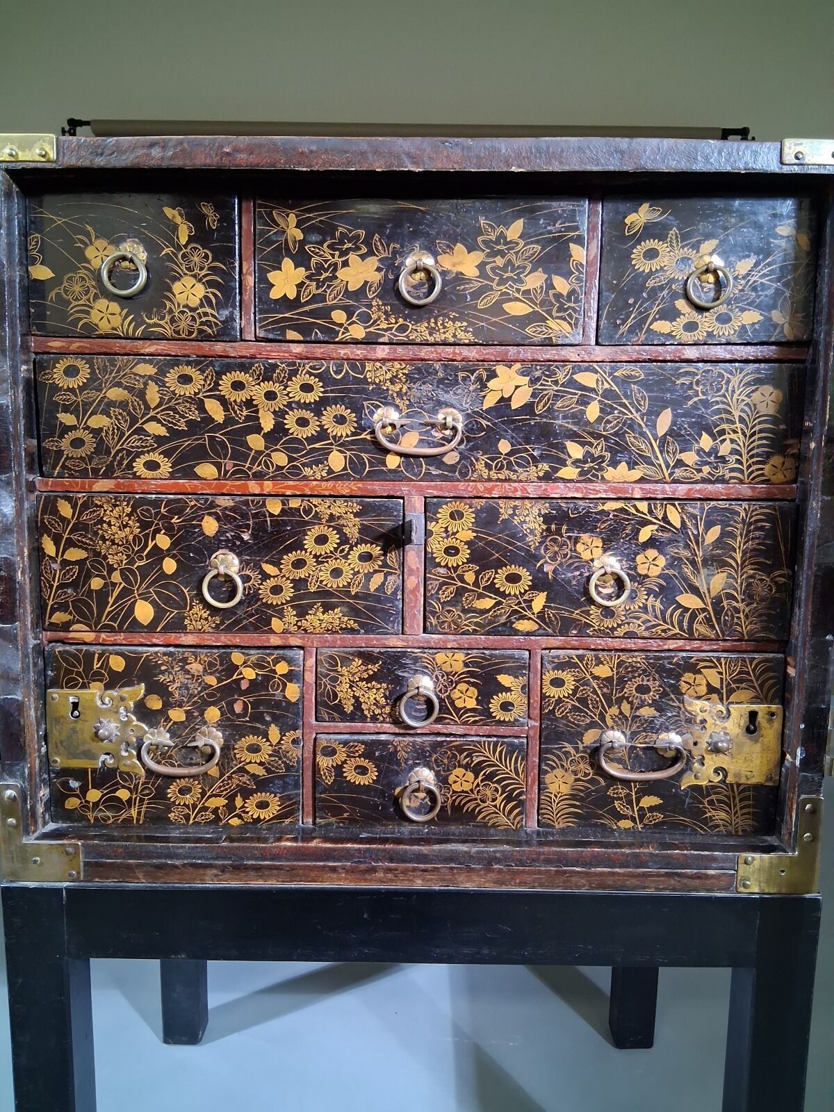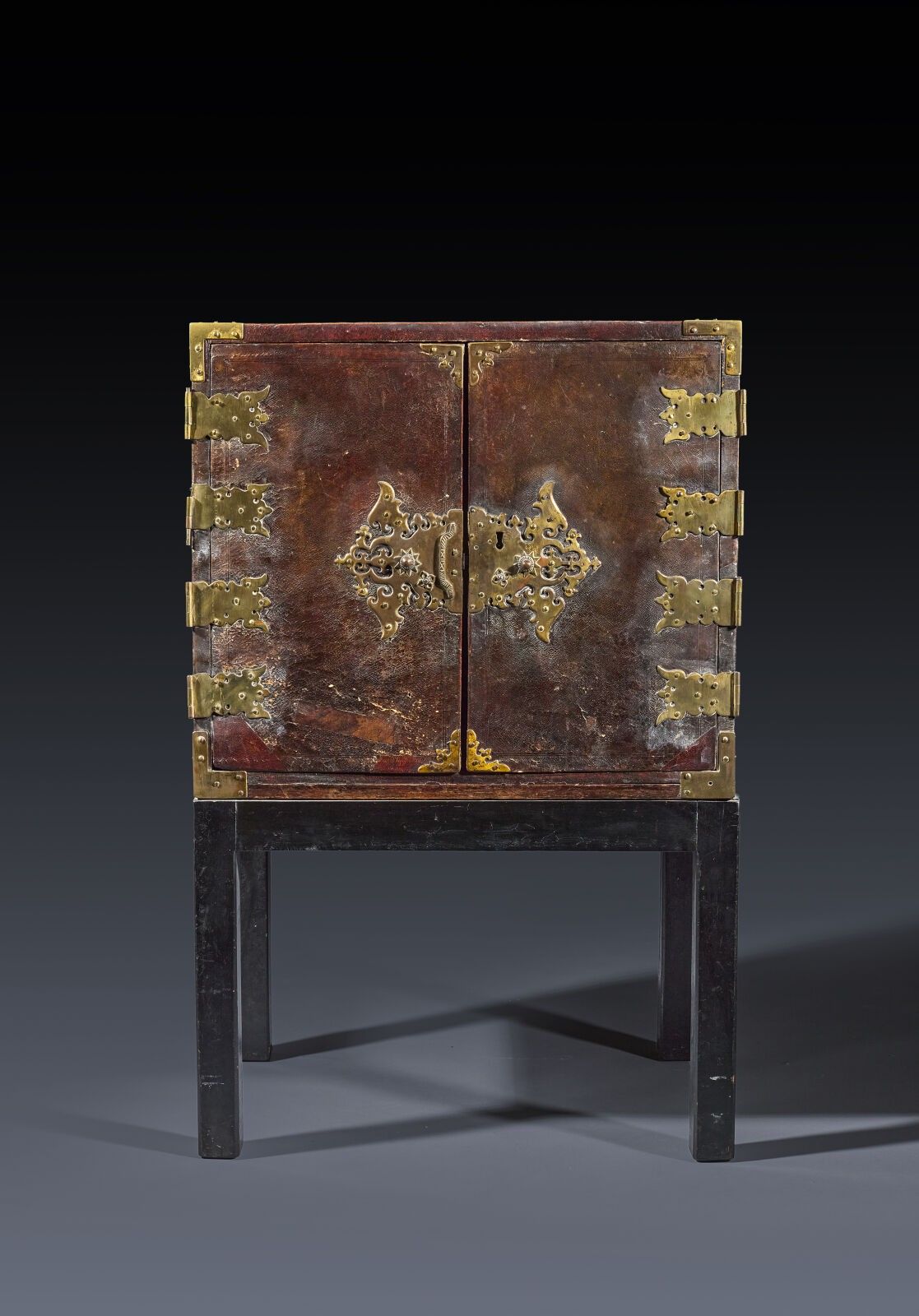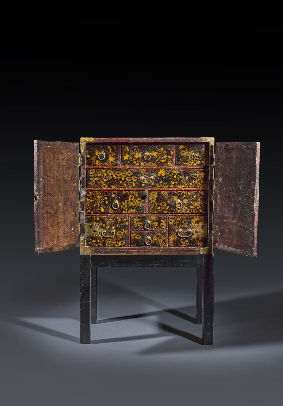 Cabinet gainé de cuir ouvrant à deux portes et ferrures en bronze, l'intérieur en bois laqué brun à décor en hira maki e de laque or de kiku et kikyo ouvrant à dix tiroirs.
