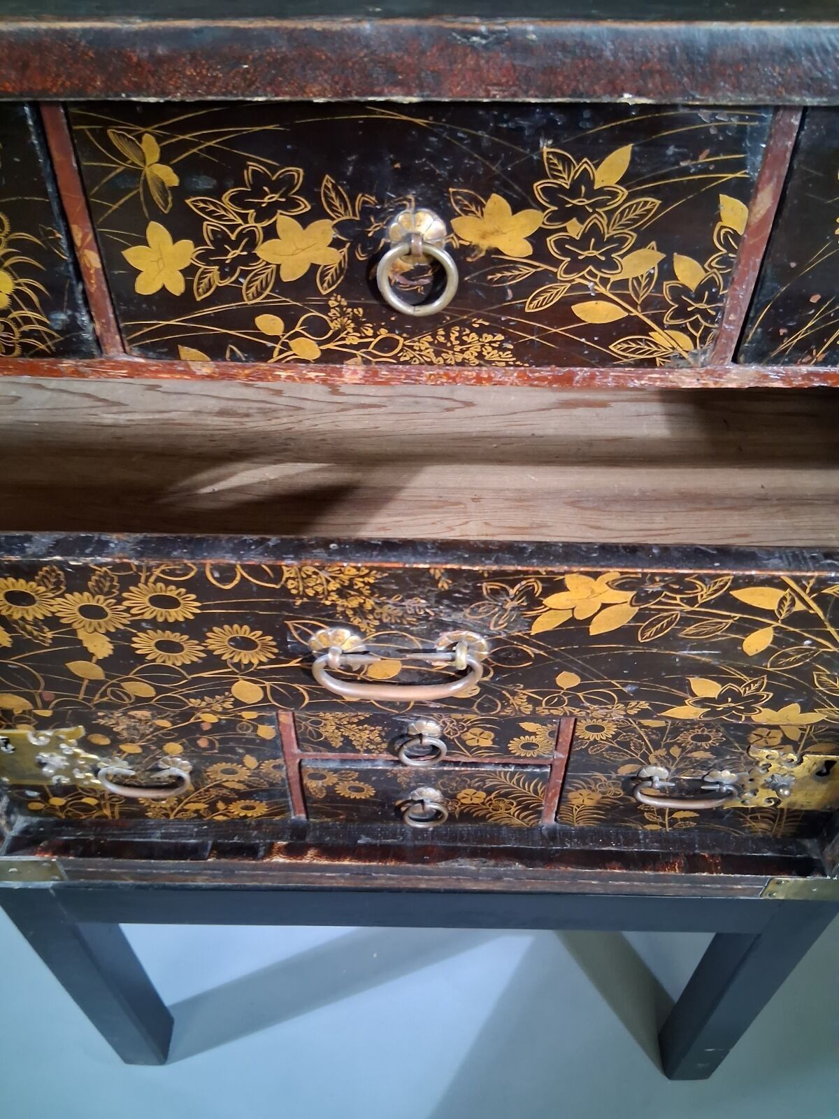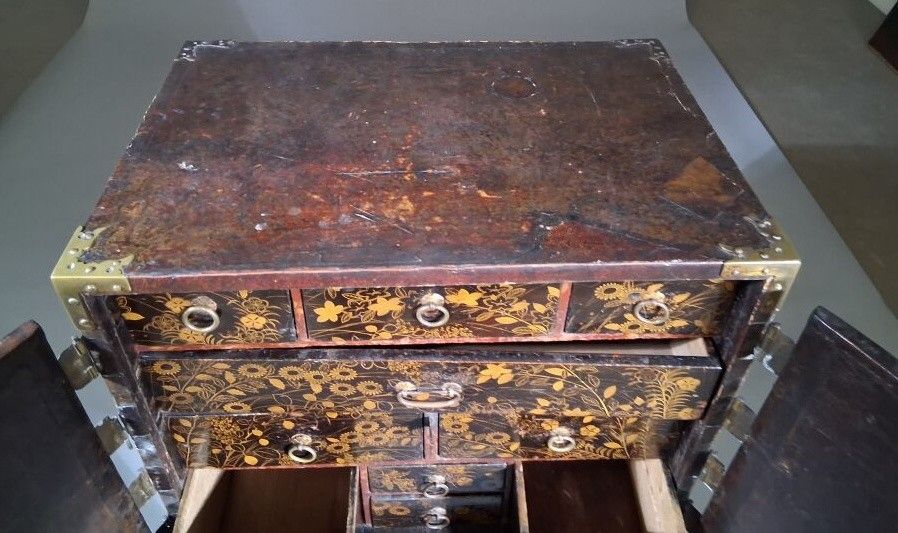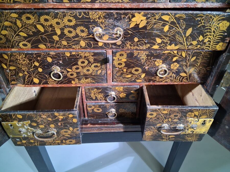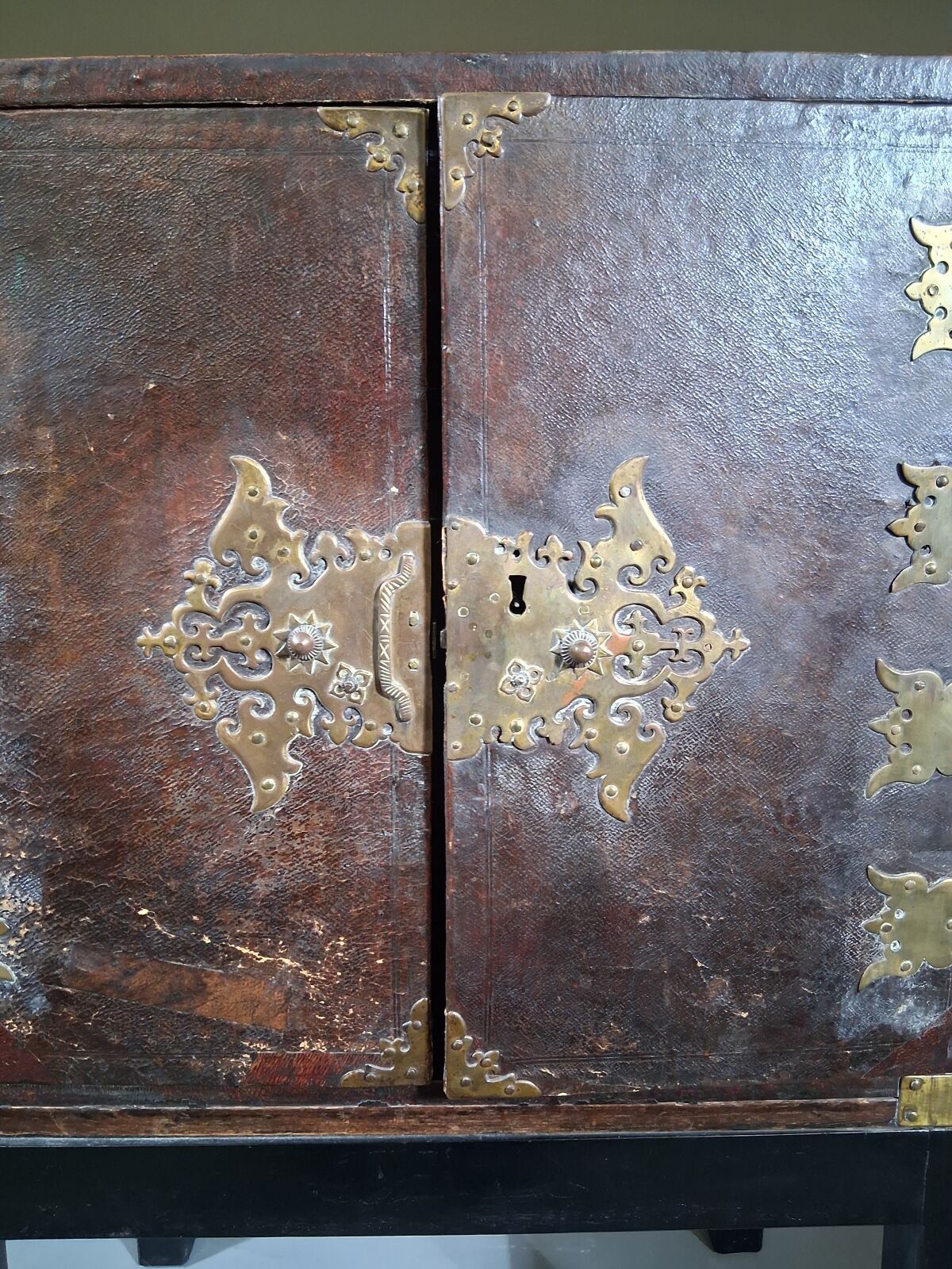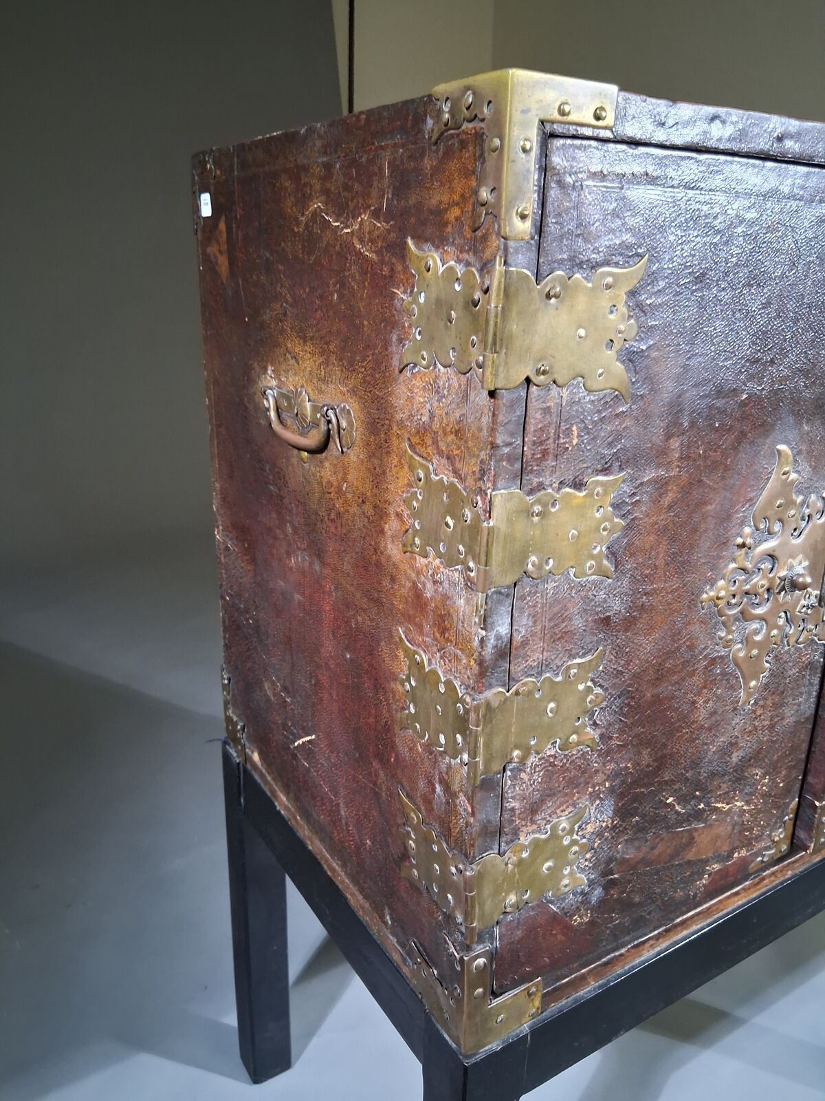 Cabinet gainé de cuir ouvrant à deux portes et ferrures en bronze, l'intérieur en bois laqué brun à décor en hira maki e de laque or de kiku et kikyo ouvrant à dix tiroirs.