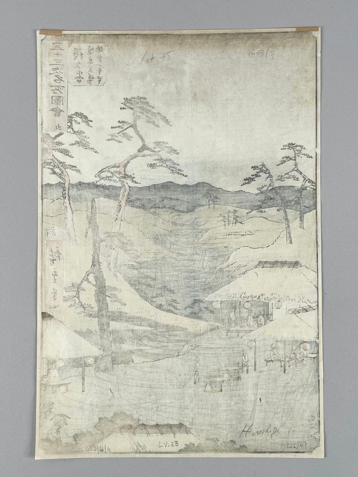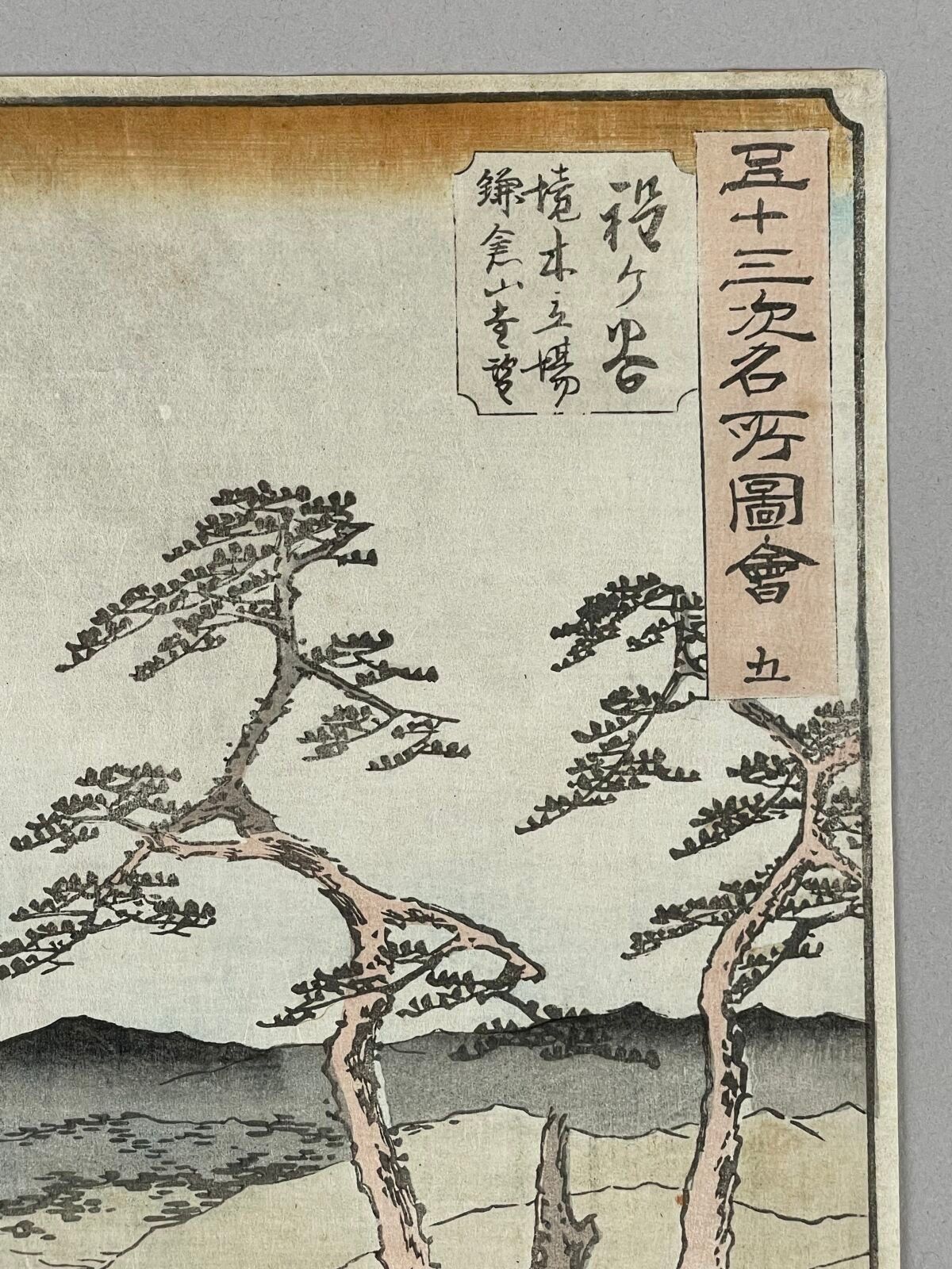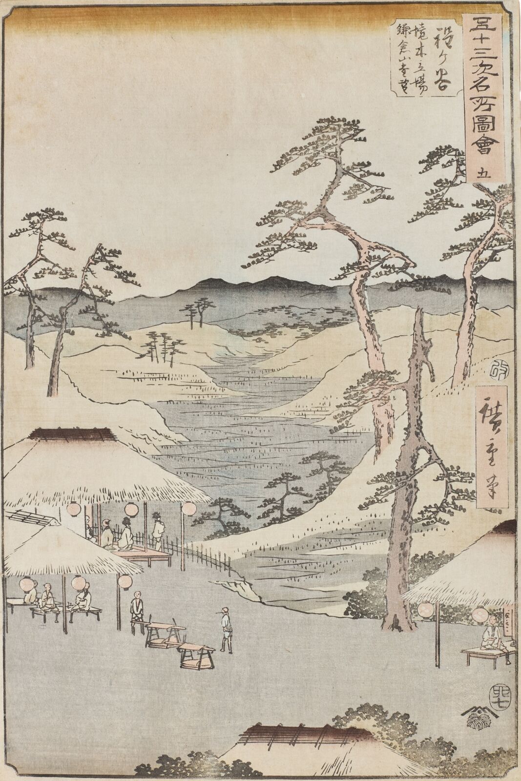 Estampe, oban tate-e, de la série Gojusan Tsugi Meisho Zue, Vues Célèbres des Cinquante-Trois Stations, planche 5. Hodogaya, Kyôboku tateba Kamakurayama enbô, Vue Distante des Montagnes Kamakura. Éditeur Tsutaya Kichizo. Cachet de censeur Aratame. Signée Hiroshige hitsu.