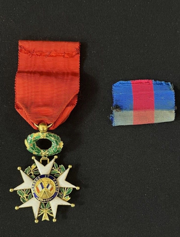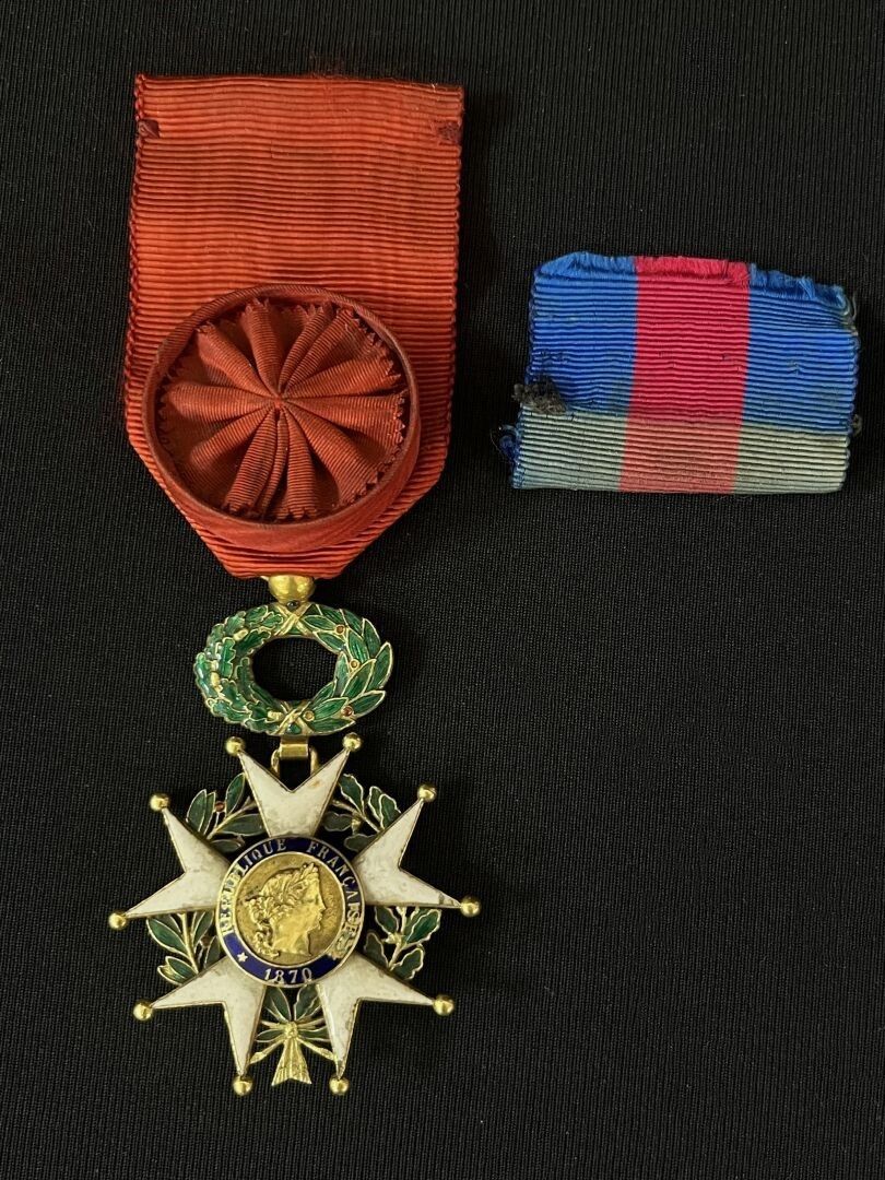 CROIX d'officier de la Légion d'Honneur en or et émail. Ruban à rosace.