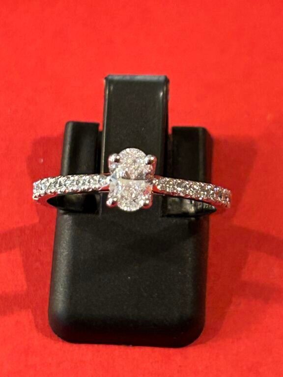 Bague en or blanc 18 carats ornée d'un diamant l'anneau pavé de petits brillants ( pierres de synthèse)
