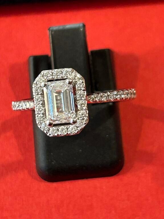 Bague en or blanc 18 carats avec un diamant taille émeraude dans un entourage de petit diamants (pierres de synthèse) pesant 1 carat.