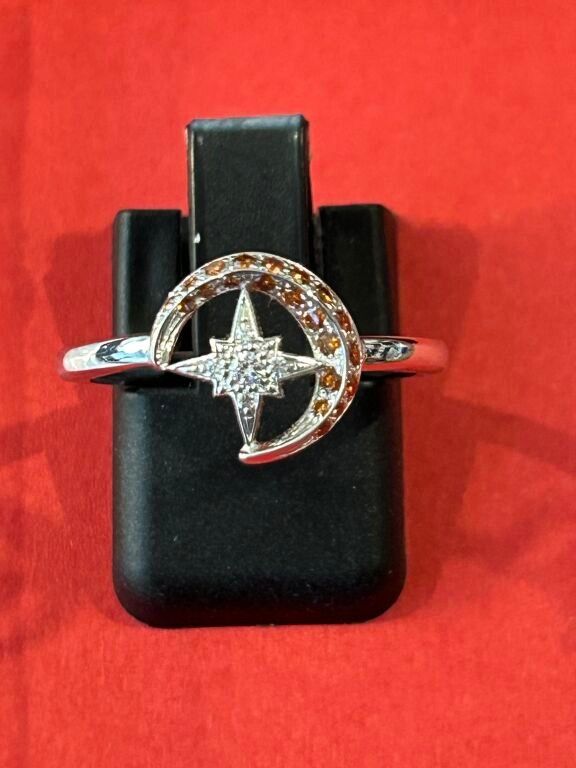 Bague en or blanc 18 carats à décor d'une étoile et d'un croissant de lune sertie de petits diamants et pierres de couleur (pierres de synthèse) pesant 0,160 carats.