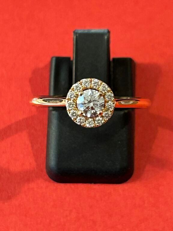 Bague en or rose 18 carats ornée d'un diamant entouré de petit diamants (pierres de synthèse) pesant 0,550 carats.