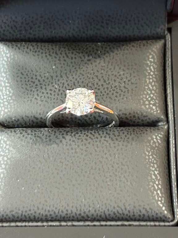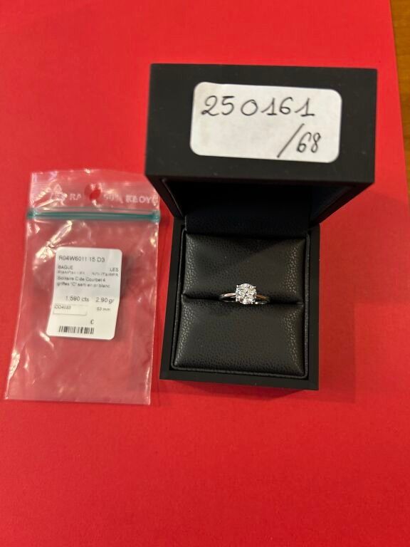 Bague solitaire en or blanc 18 carats ornée d'un diamant ( 1,590 carats)(pierre de synthèse) dans son écrin